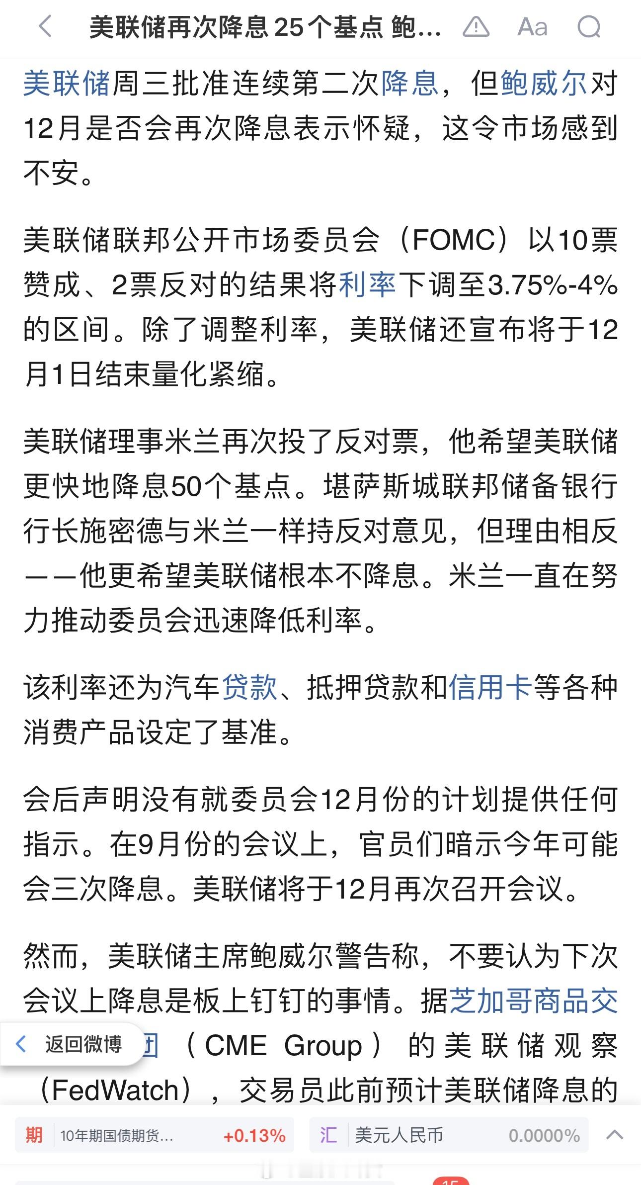 降息美联储再次降息25个基点,鲍威尔警告12月降息并非板上钉钉[并不简单]
