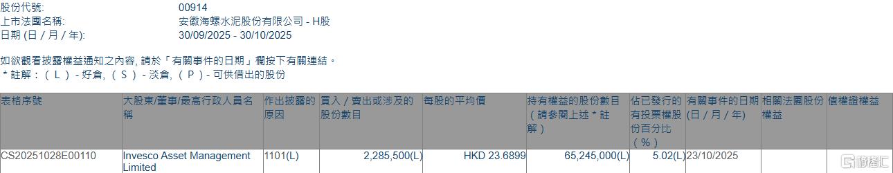 格隆汇10月30日丨根据联交所最新权益披露资料显示,2025年10月23日,海螺水泥(00914.HK)获InvescoAssetManagementLimited在场内以每股均价23.6899港元增持228.55万股,涉资约5414.33万港元。