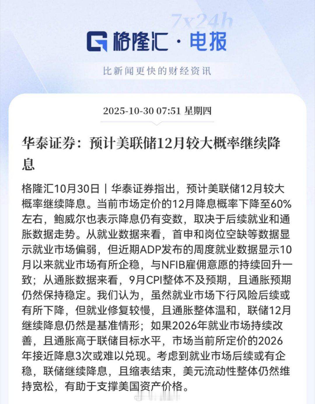 华泰证券:预计美联储12月较大概率继续降息降息a股