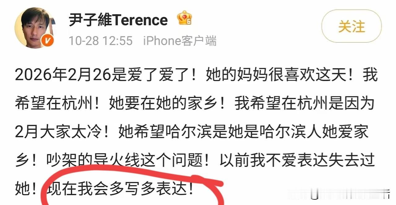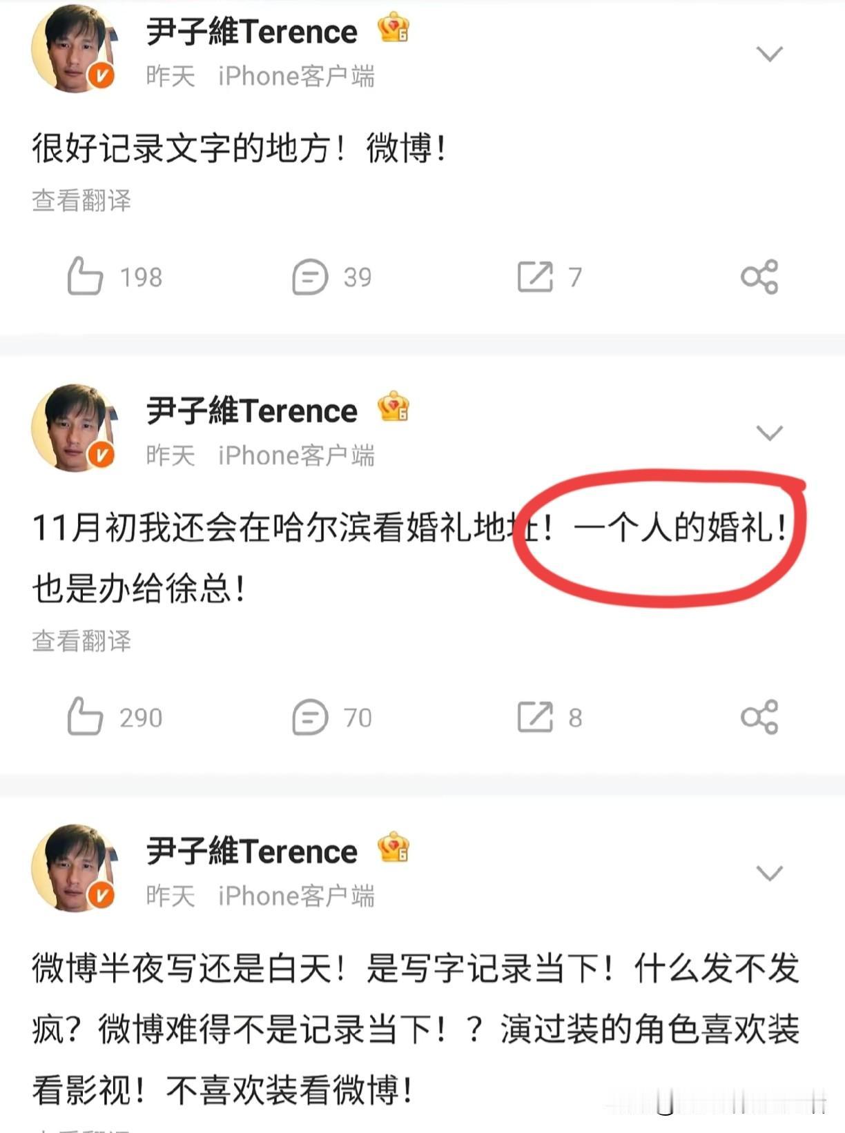 这两个人不知道是谁的情绪不稳定,经常在网上这个样子,跟小孩吵架一样。很难想象结婚以后会怎么样。 每一次的情绪变化,网友都会知晓的清清楚楚,原因就是尹子维会不停的碎碎念,口口声声爱徐总,喜欢自由的表达,可是这个样子真是爱的表现吗? 反正吃瓜群众无所谓,日子是你们自己的[笑哭][笑哭]