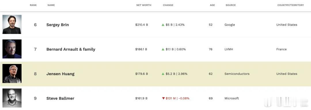 而作为公司的灵魂人物,CEO黄仁勋的个人财富也随之暴涨。以当前持股计算,他的身家达到1792亿美元,登上福布斯富豪榜第八位。