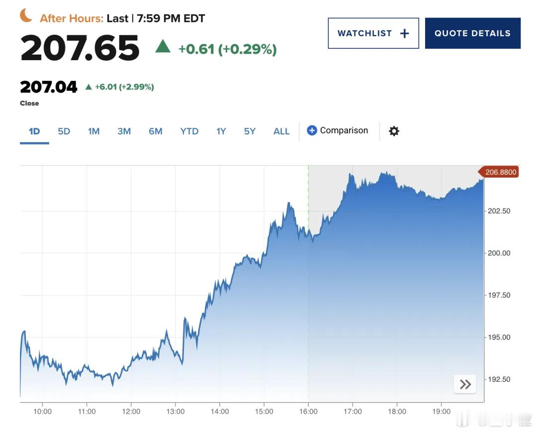 这家因AI而霸榜的科技巨头,在美股盘中一度涨超5%,股价最高达212.19美元/股,收盘稳在207.04美元,市值直指5.03万亿美元。