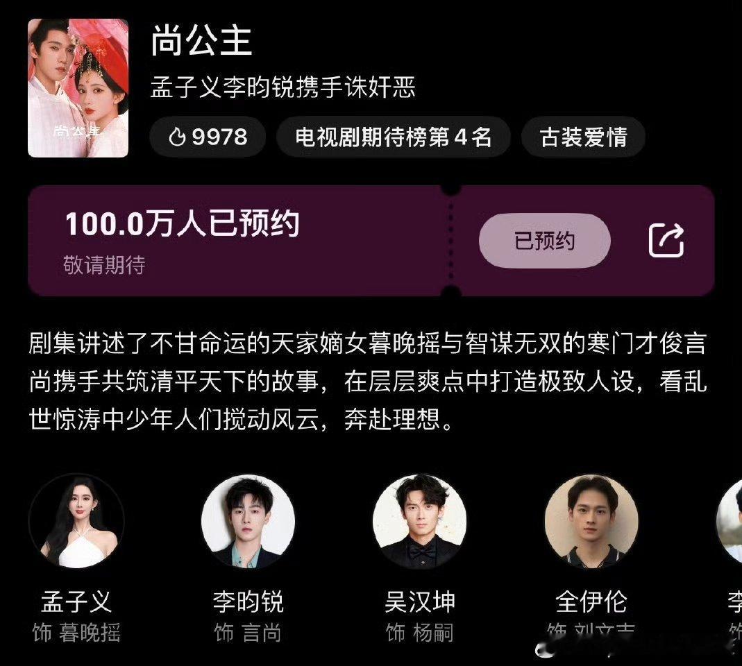 李昀锐《尚公主》预约破100w了,恭喜小林!恭喜天选文臣言尚!🎉