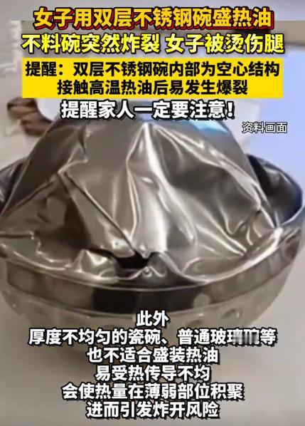 “悲剧还是发生了!”9月16日湖北恩施,一女子热好油后,随手拿了个不锈钢碗,她盛放的过程中,碗突然炸裂,热油瞬间溅到女子腿上,疼的她大声尖叫,事后她才了解爆炸的原因,网友:玻璃碗也不能盛热油! “啊!好烫!”那一声惨叫,几乎把整个厨房的宁静都撕碎了。当时女子准备做晚饭,热油的香气刚刚飘起来,没想到,一个细节的疏忽,竟引发了令人后怕的“厨房爆炸”。 女子把锅里的油加热好后,准备盛出来备用。可家里找来找去,没有合适的器皿,于是顺手拿了个看起来“结实亮堂”的不锈钢碗。她想都没想,就把热油往里倒,结果“嘭”的一声闷响传来,油碗炸裂,滚烫的热油飞溅开来,溅到了她的小腿上。 事故发生后,女子一直纳闷:“这不锈钢碗不是能耐高温吗?怎么会炸?”直到医生解释,她才明白原委。 原来,这种“爆炸”跟不锈钢的材质和结构有关。很多家庭常用的不锈钢碗,其实是薄钢材卷压而成,中间可能存在微小的空隙或焊接痕。如果碗底潮湿,接触高温油时,水分瞬间气化膨胀,就会像小型炸弹一样把碗炸裂。 而且一些廉价不锈钢碗为了成本,会掺杂杂质金属,耐温性能远不如纯钢材,遇到200度以上的油温时,非常容易出事。 不少网友看到这段视频后,都表示“看着都疼”。有的人说:“我家以前也这样干过,还好没出事。”也有人提醒:“别说不锈钢碗,玻璃碗、瓷碗、甚至一些塑料碗,都不适合盛热油。”。 有人曾经用玻璃碗装过炸鸡油,结果碗底直接炸成碎片,油花四溅,差点烧到厨房窗帘;也有人用塑料盆洗炸完的锅,塑料直接融化粘锅。说到底,这类事故,都是一个“想当然”造成的。 谁也没想到一个普通的做饭动作,带来的却是血的教训。女子说自己家常年用那只碗装菜、蒸饭,早就习惯了,根本没想过热油有这么大的威力。医生告诉她,厨房伤害中,油烫是最常见也最严重的一种,一旦处理不当,很容易感染留疤。 生活中真正可怕的,从来不是那些看得见的风险,而是那些被忽视的“理所当然”。就像这次事件,不是设备坏了,也不是操作复杂,而是太普通、太熟悉,以至于没人多想。可一旦出事,代价往往巨大。 这起事件没有造成更大的悲剧,已经算是不幸中的万幸。但希望通过她的经历,能让更多人长个心眼。别让一次随手的疏忽,换来一辈子的遗憾。 可能很多人会习惯说:“没事的,我以前也这么干。”可事实是每一次“没事”,都只是在幸运的庇护下。而幸运,并不是永远都有。所以,别拿经验挑战科学,更别拿身体去赌一次“应该没问题”。 信息来源: 光明网丨突然炸裂!女子多处严重烫伤,浙江不少人家都有这种碗 文丨小王 编辑丨史叔