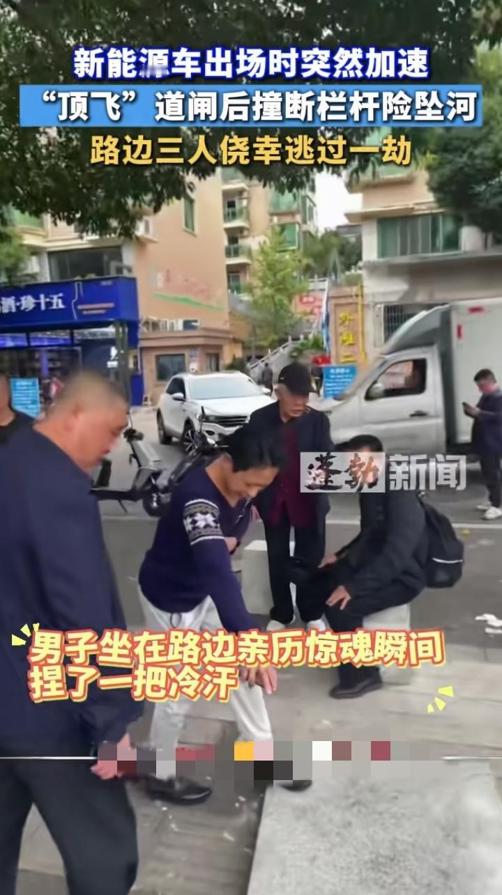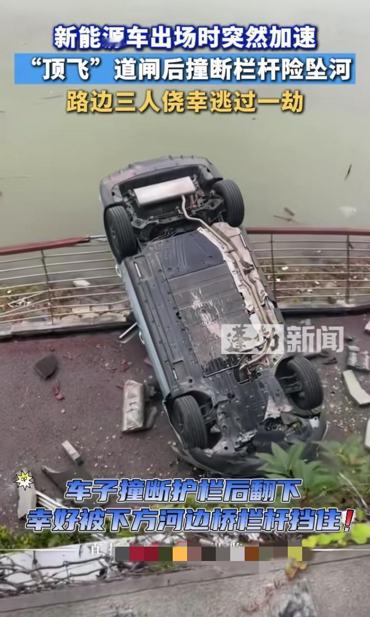 近日重庆,一新能源汽车出场时,突然加速,直接撞开道闸,冲向了坐在路边下棋的3人,结局令人意外! 3人在路边下棋,突然发现有辆车冲了过来,连忙躲闪,汽车则冲向栏杆坠入了河边!好在栏杆下面还有一条景观路,否则汽车会直接坠入河里去!不知道驾驶员是什么缘故,出停车场时,会突然加速冲了出去,导致发生了这样的事!