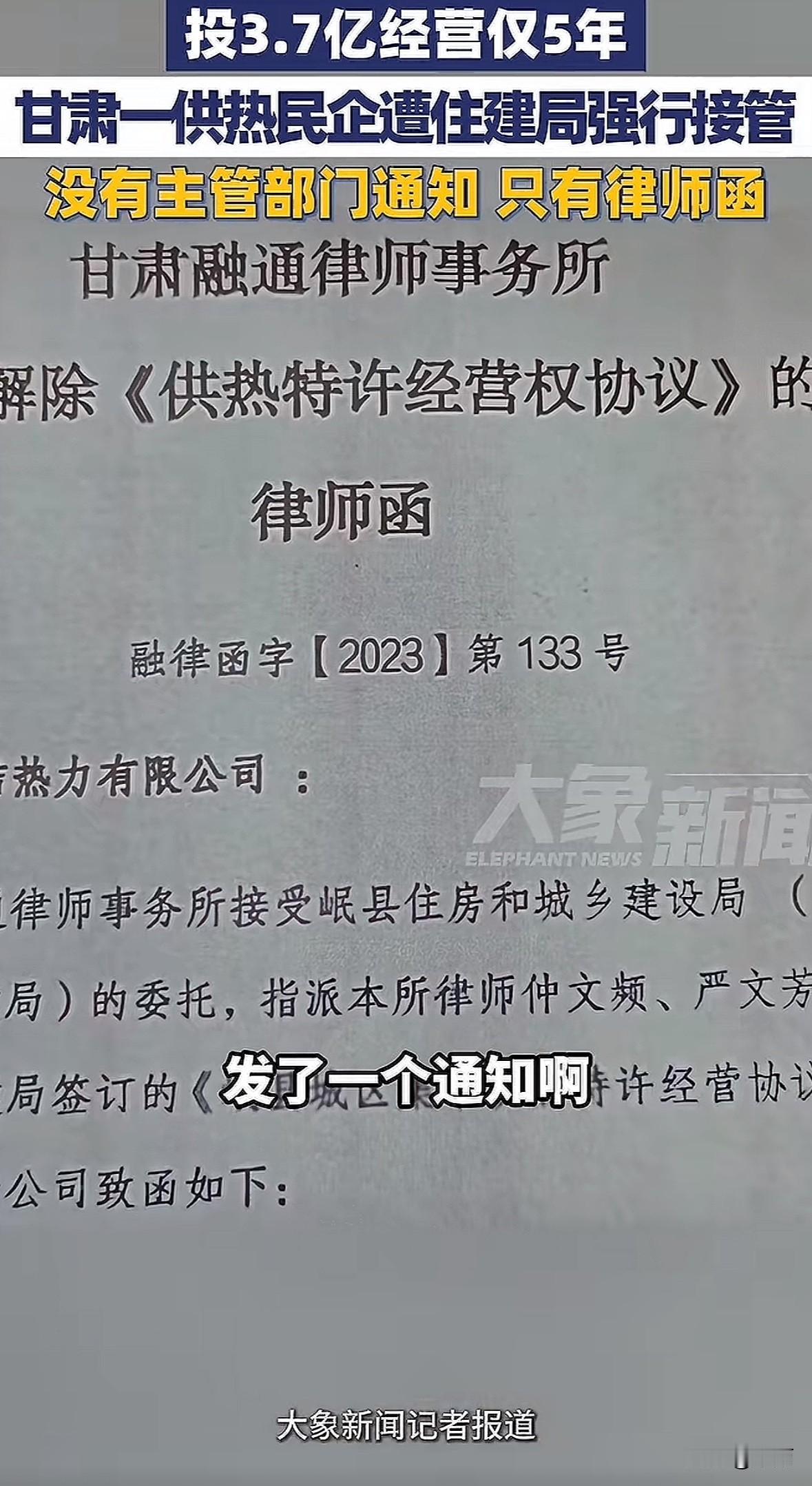 2018年,甘肃岷县宏源热力公司靠招商引资拿到30年供热特许经营权,投了3.7亿建热源厂、管网这些设施。 才经营5年,2023年就被住建局用律师函解约,工作组直接接管资产,经营权给了城投公司。 公司亏惨了,一方面煤炭涨价、疫情影响,更关键的是一万多户欠费,还有上千户“人情暖”,领导打招呼就不能收费。而且城投后来也搞供热,独家经营权早没了。 现在公司告了县政府,法院已经受理。 特许经营权不是说变就变的,招商引资得讲信用。供暖是民生大事,但企业的合法权益也得保障,不然以后谁还敢来投资?这事得等法院判,看看理到底在哪边。