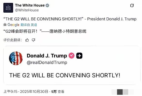 白宫转发特朗普的帖子:G2峰会即将召开! 服了川普这老小子,又创造个新词,果然还要靠硬实力!