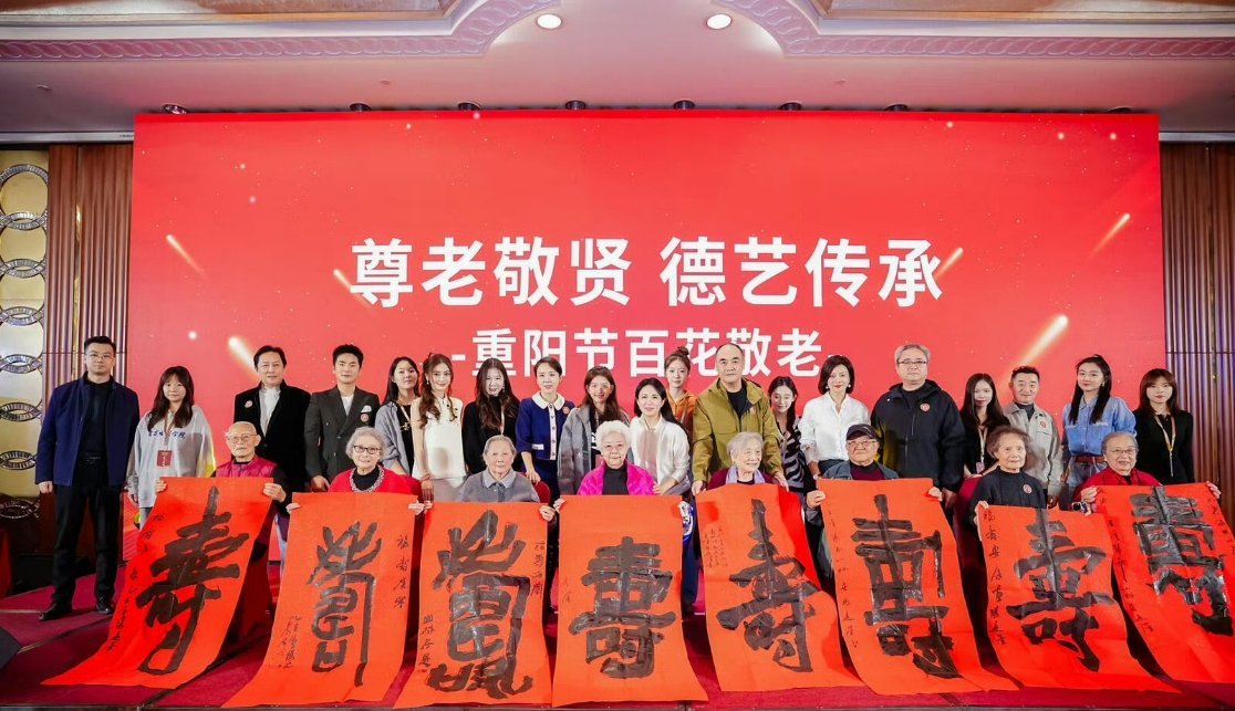 肖战的大海报出现在全国影视行业举办的新老艺术家重阳百花敬老节活动上[桃里桃气]