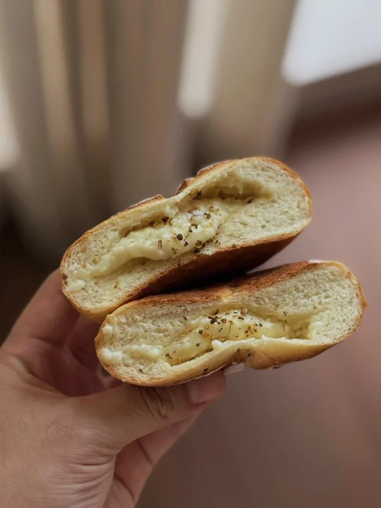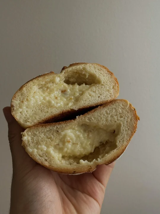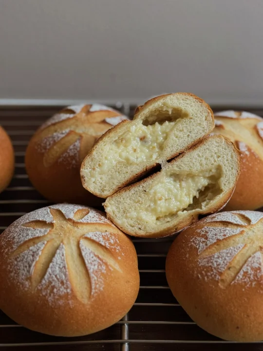 拍掉边缘气泡,翻面,挤上酒酿馅儿