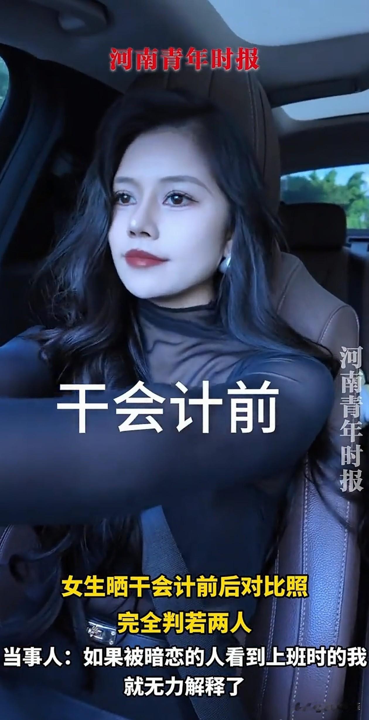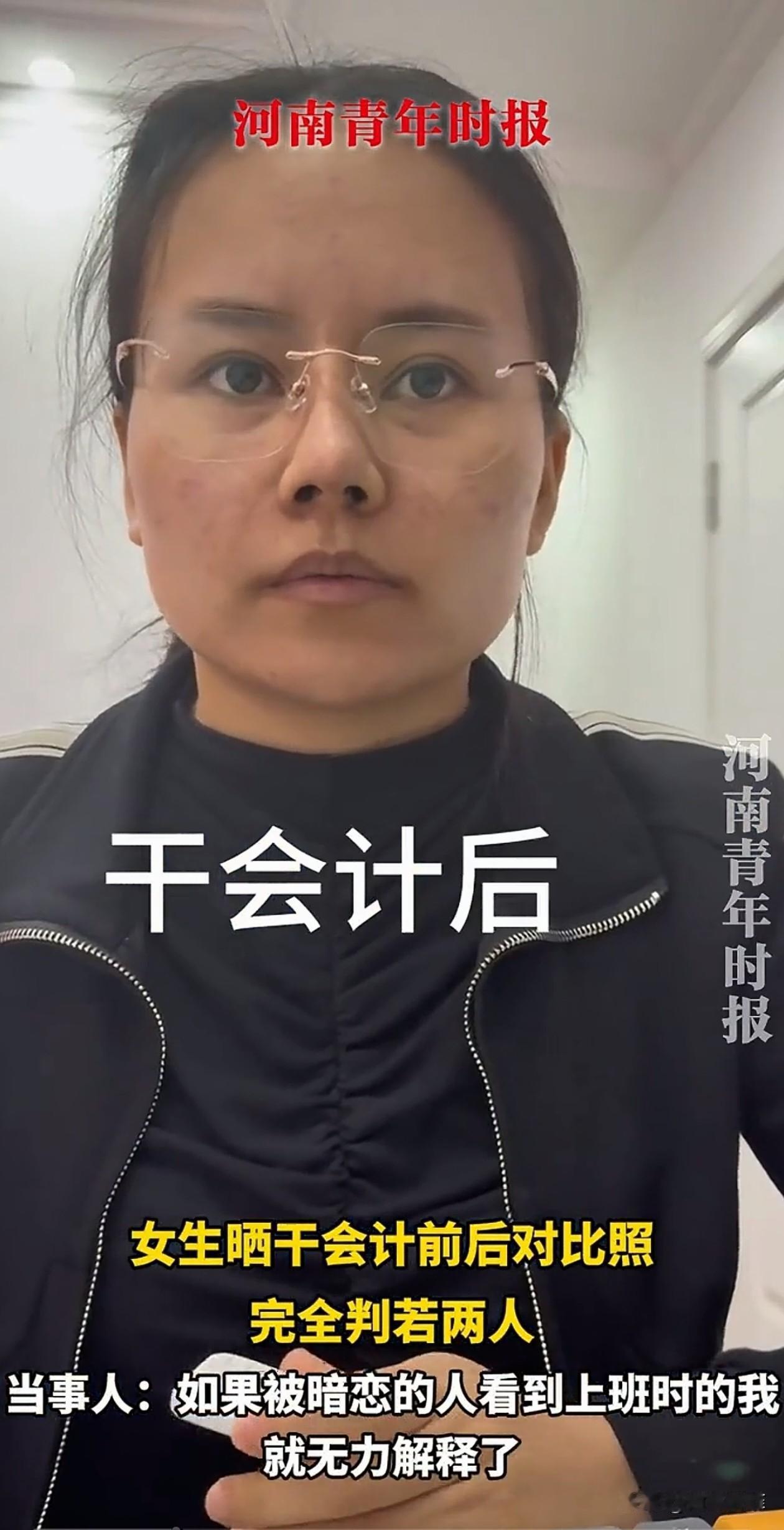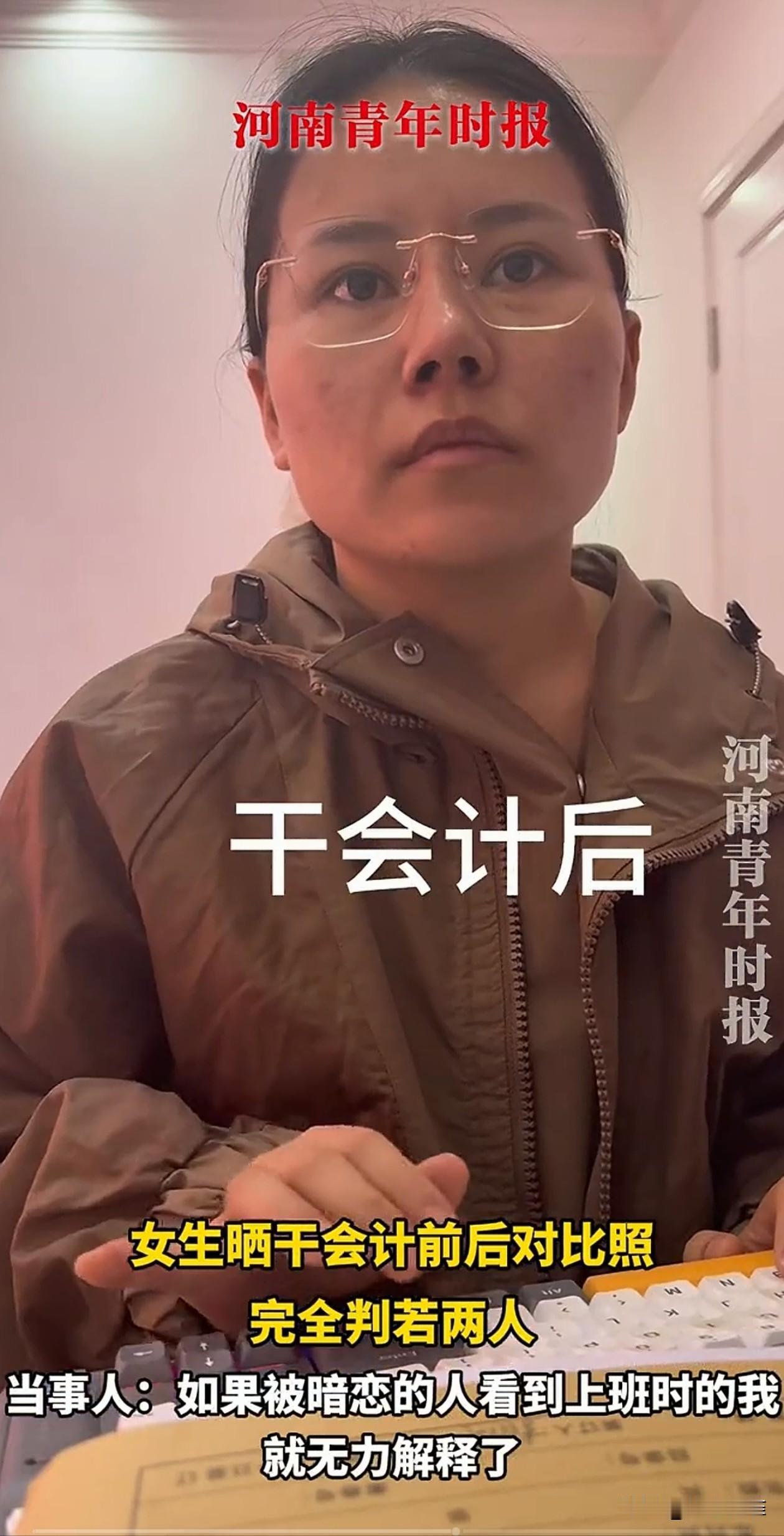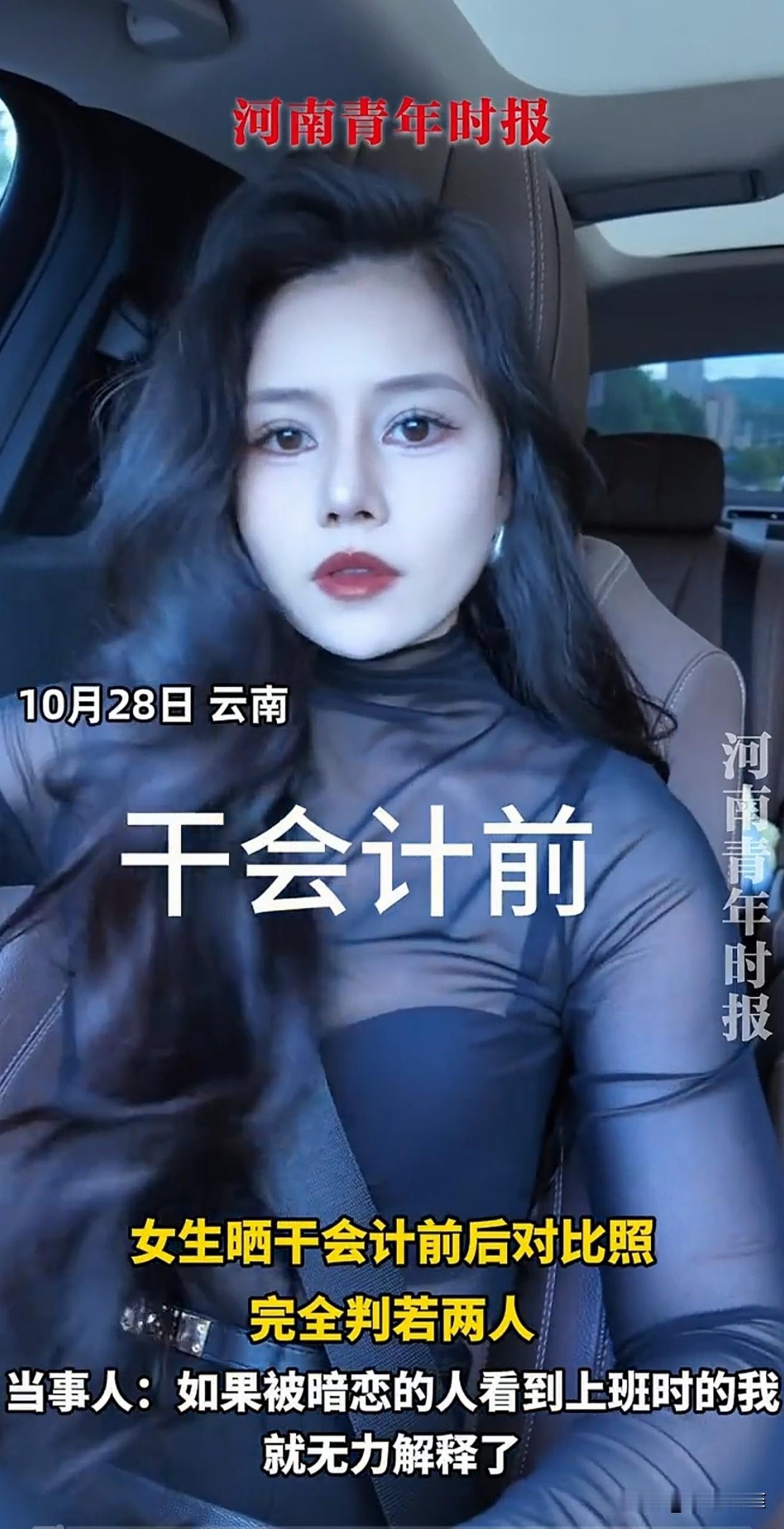 女子晒出自己干会计两年后的变化,前后差别判若两人,前一秒还是红唇大波浪的御姐,后一秒就变成了素面朝天的打工人。网友:太真实了。 云南,视频中,女子做会计前,御姐范十足,乌黑的长发微卷,化着精致的妆容,涂着红唇,还戴了美瞳,坐在车里自拍时眼睛都发亮,穿了件黑色礼服气质特别出众。 做会计后女子像换了个人。长发随意扎起来,美瞳换成了有框眼镜,脸上一点妆没化,整个人看着很朴素,还带着点疲惫。 女子自己也调侃,只要上班足够丑,下班就没人认识她。 她还说,如果被暗恋的人看到上班时的样子,就无力解释了。 有会计同行的网友表示,太真实了,工作忙起来根本没精力化妆,早上只想多睡一会,上班怎么方便怎么来。 还有网友感叹,精致需要时间和心力,但成年人为了生活和责任,只能先把精力放在工作上。 女子的前后对比照不是变丑了,而是为了工作藏起了精致,磨练出了沉稳,是女子日常的真实记录。