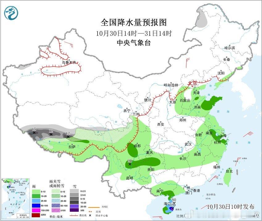 【降水】今天08-14时,降雨最强的区域还是在海南,琼中6小时雨量66.3毫米。另外湖南江西安徽浙江等地也出现降雨,并且继续东移。冷空气南下,华北部分地区也出现降雨。今天下午到明天中午,海南岛还有大雨-暴雨,局地大暴雨。华北和江南降水缩减,西藏的雨雪增多增强。