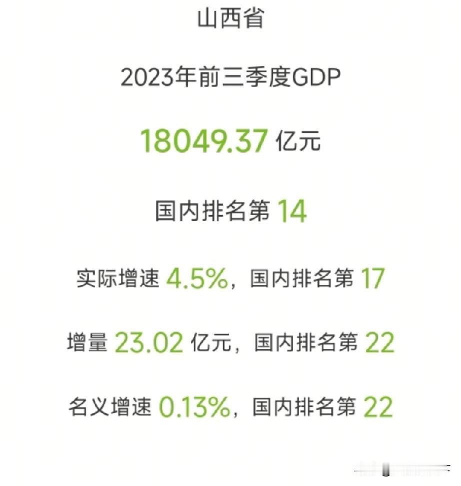 山西省这5年过得就像坐过山车,从高处直冲洼地 山西省是非常低调的一个省份,提起山西,大多数外省人脑子里只有一个词语“煤老板”,在各大社交平台上,基本上看不到关于山西的新闻,好坏都没有,山西网友也很低调,从不树敌,也不争吵,只有每年发布gdp数据时候,大家才会关注山西,甚至增量不够了,自然而然会把山西算在负增长行列里。 山西省其实不是一直这么低速发展的,2021年,2022年时候,煤炭资源涨价,山西发展速度引领国内各省市,甚至跑出24.69%,15.67%的名义增速,全国第一。 2023年是山西的转折点,随着绿色经济的发展,煤炭对国民经济的作用在下降,煤炭经济的增长乏力,导致山西的经济也增长乏力,以至于这3年时间都没有缓过来。 山西面临的问题,更多的是需要高层和智库们去分析解决,普通网友只会感叹一句:山西,成也煤炭,败也煤炭。山西 山西城市排行 山西城市GDP 山西地形 山西经济排名 山西风貌 山西地形图
