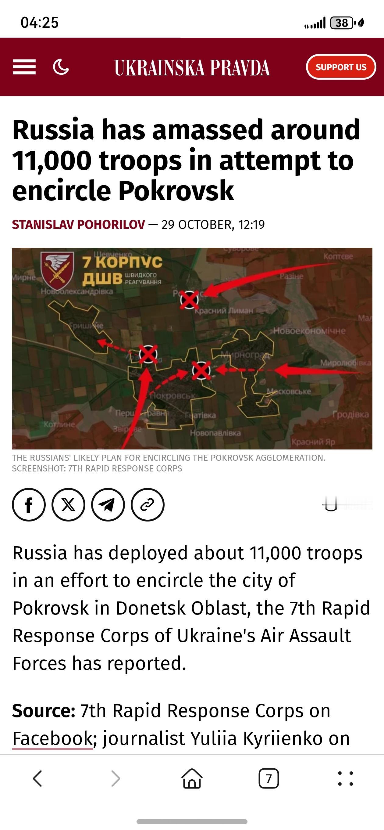 乌克兰空降突击军第7快速反应部队10月29日在Facebook上的发布消息,俄罗斯已部署约1.1万名士兵,试图包围顿涅茨克州的波克罗夫斯克市。 第7快速反应部队声明原文:“敌军(俄军)已部署约1.1万名士兵,试图实施包围波克罗夫斯克城市群的计划。已渗透进入该市的敌军部队正试图向波克罗夫斯克西北和北部方向推进。” 第7军表示,在其负责的作战区域内,俄军已集结约2.7万名人员、约100辆坦克、多达260辆装甲战斗车辆,以及多达160套火炮系统和迫击炮系统。 该部队指出:“波克罗夫斯克城市群的守军(乌军)正持续执行防御作战任务。” 在过去两天内,第7快速反应部队责任区内的乌克兰守军共击毙90名俄军士兵,击伤42人。 乌克兰部队还摧毁了1辆装甲运兵车、3辆步兵战车、3辆其他车辆和1辆摩托车,并击落或缴获了158架各型无人机。在波克罗夫斯克市内,有18名俄军士兵被击毙。 乌克兰真理报记者尤利娅·基里延科发布了一段视频,显示一面俄罗斯国旗在波克罗夫斯克市入口的标志牌上飘扬。 基里延科在社交账号帖文中写道:“我们的部队刚刚发来这段视频。波克罗夫斯克入口标志上挂着一面俄罗斯破旗。你们可以亲眼看到一切,无需再多言。愿我国武装力量力量强大。” 背景:此前,“DeepState”情报平台曾报道,俄军持续渗透进入顿涅茨克州的波克罗夫斯克市,逐步增加步兵力量,并在市内扩大破坏与侦察行动。俄乌战争