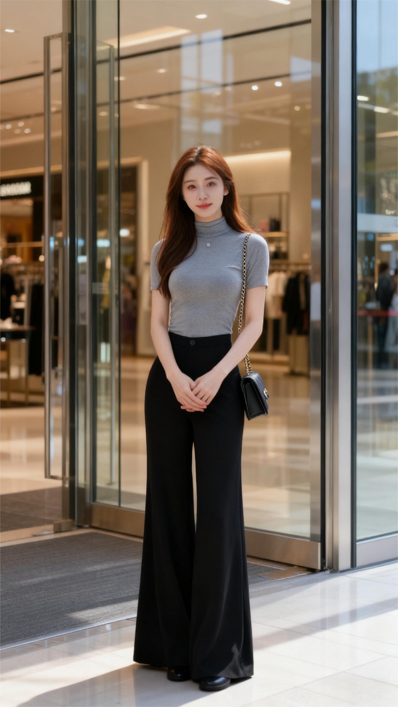 她身着灰色缎面连衣裙,搭配黑色高跟鞋与棕色手袋,简约优雅,尽显职场干练气质,是街