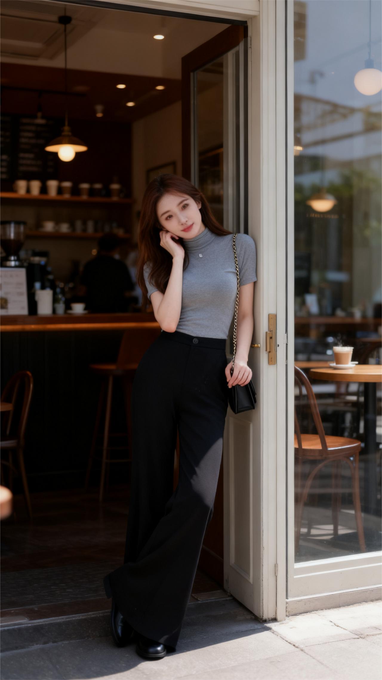“灰衫黑裤衬娇姿,绿意丛中笑若诗。”