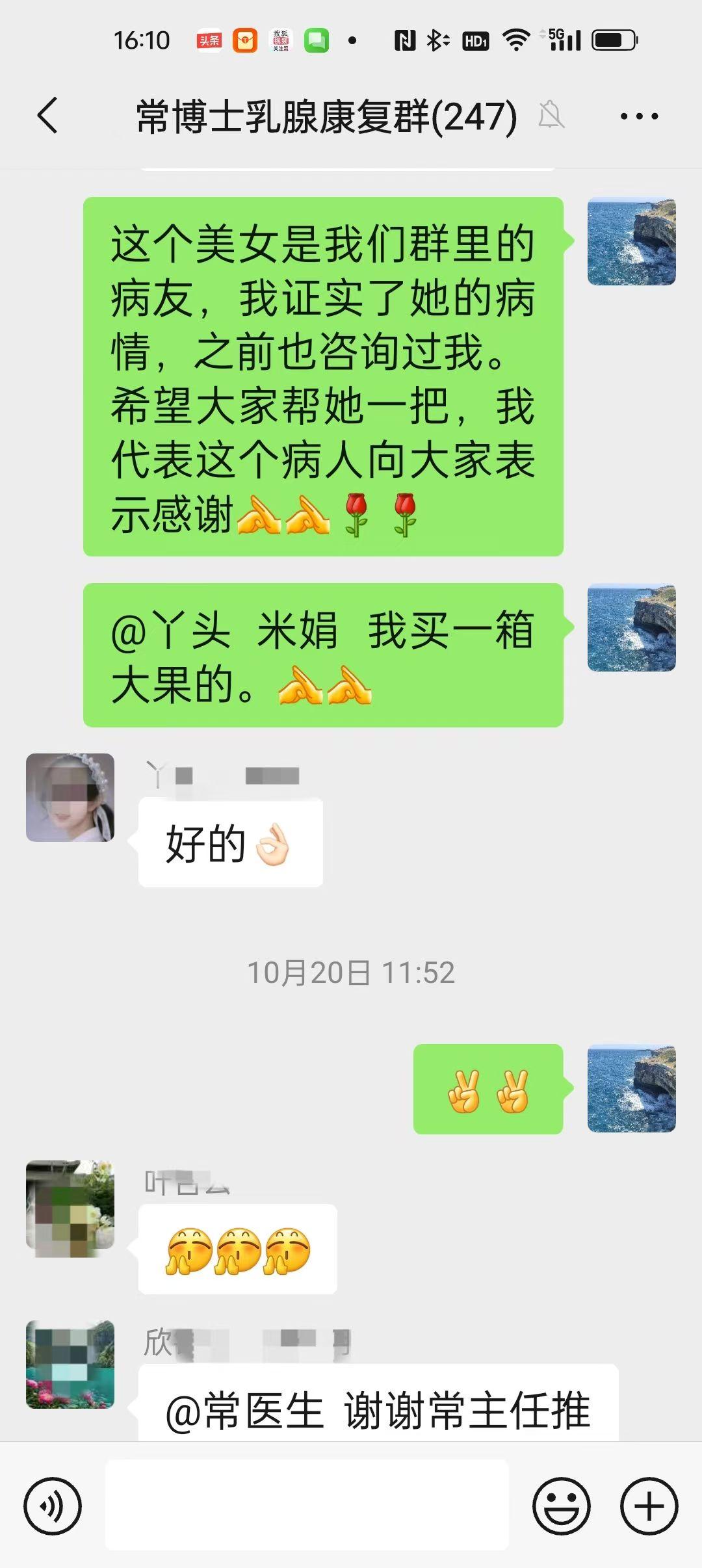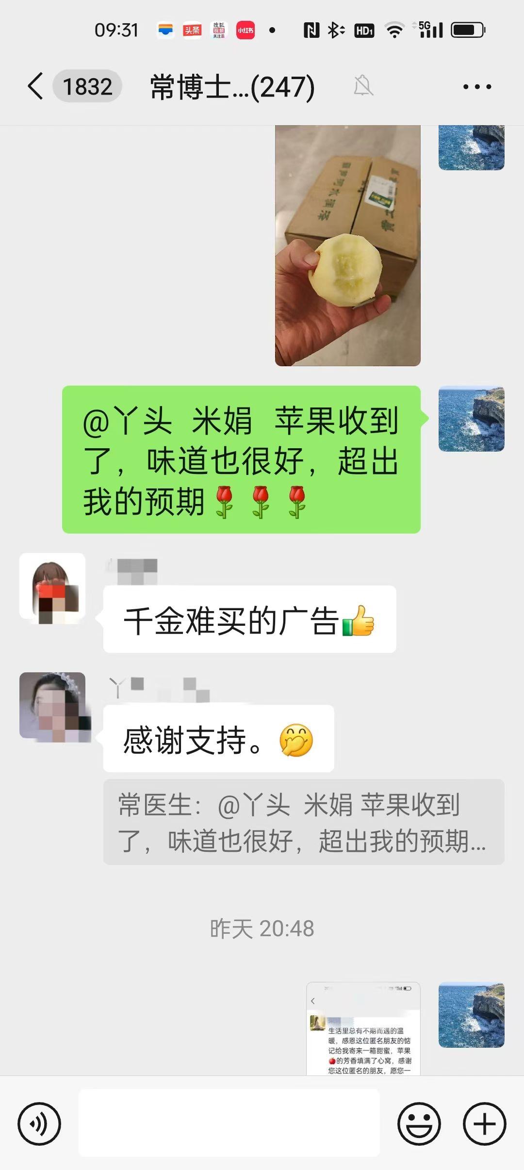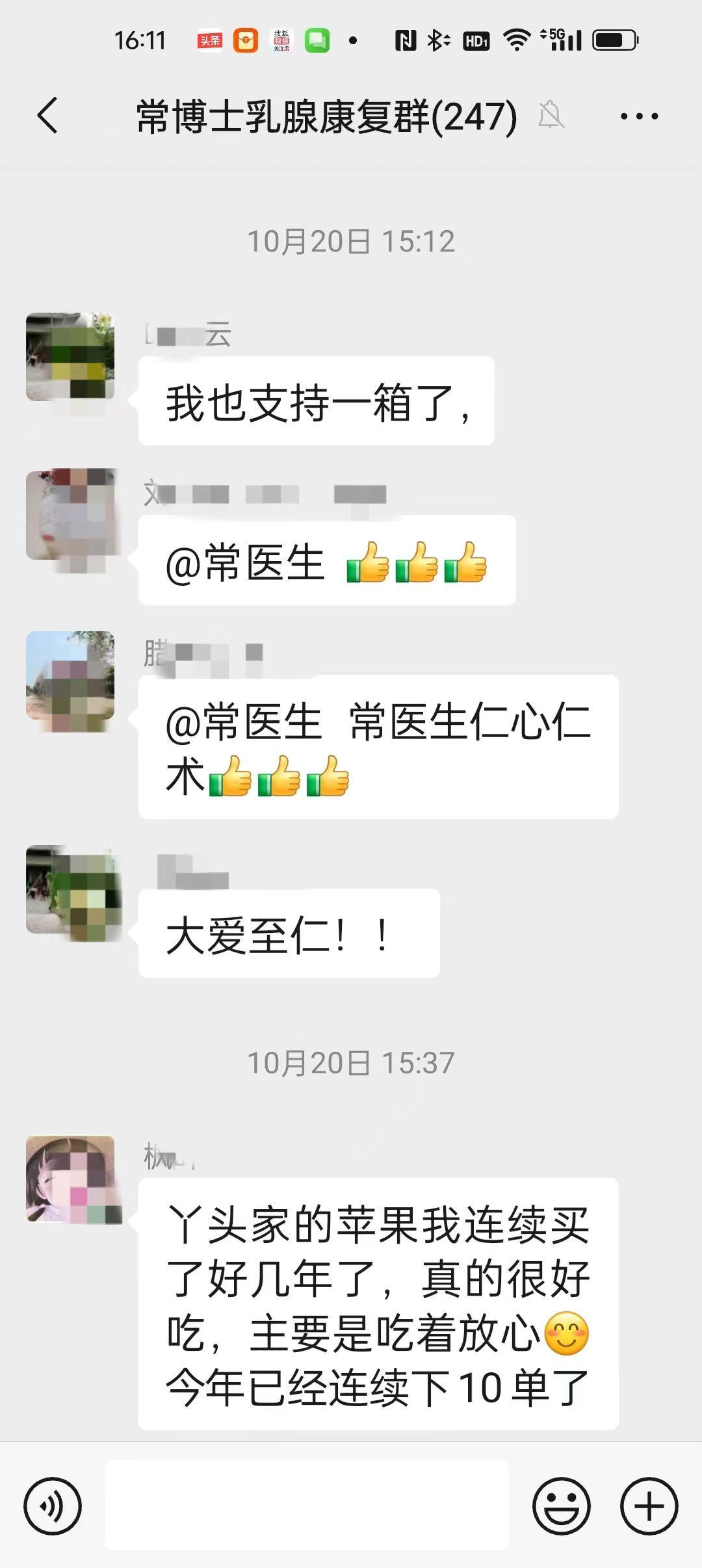 我帮病人卖苹果🍎🍎: 作为一名医生,给病人看病是应该的,怎么会帮病人卖起了苹果呢?其实这还真是一个医缘巧合。这位来自甘肃的三十一岁的女病友在网上找我治疗乳腺癌,多次的问诊治疗过程中,得之她也真是一个不容易的女人,十一岁的时候,父亲车祸离世,母亲一人把她们姐妹几人带大,而今她又得了乳腺癌,家里主要的经济就是几亩地的苹果,虽然今年苹果收成不错,但卖不出去,得知这个情况,我就把这个病友的苹果问题放在了我的乳腺癌病友群里,没想到得到了大家的积极回应和热心相助,有人说,我们都是乳腺癌病友,病友们理应相助,我们不仅要相互激励燃起信心,更要一起相助度过生活的难关,于是大家你一箱我一箱的买,有的还推荐给自己的朋友买,才几天的时间,就把这个甘肃女病友的苹果买完了。 人心齐、泰山移!其实医生和病友是战友关系,共同对付疾病,我帮病友卖苹果,也是应该! 轻轻咬了一口手里的苹果,真的是甘甜脆爽,这是我吃到的最好的苹果🍎!