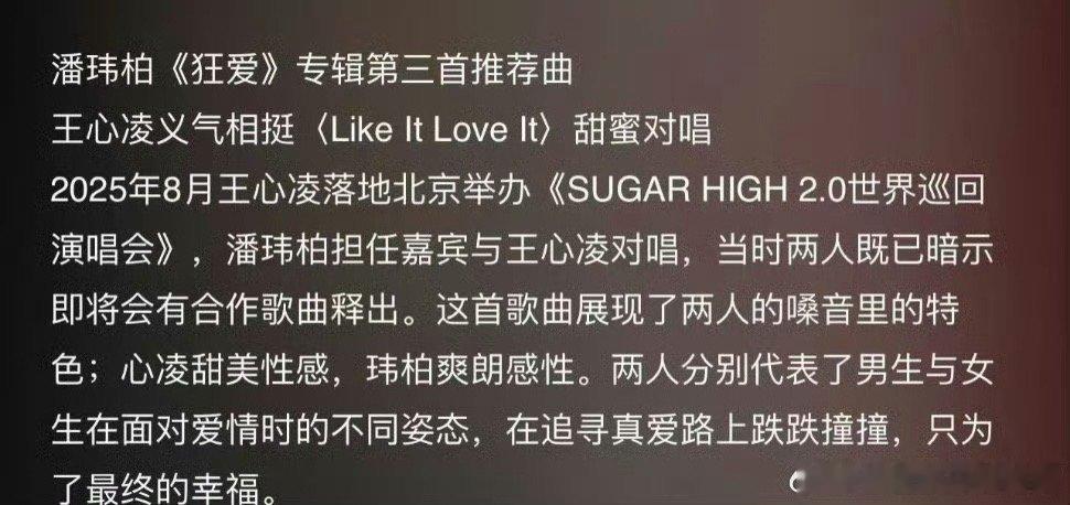 潘玮柏王心凌合作 甜歌天花板合体!潘玮柏王心凌合作曲《Like It Love It》藏在新专里,演唱会互怼后放大招,完美视听暗示MV?能不能立刻上线!