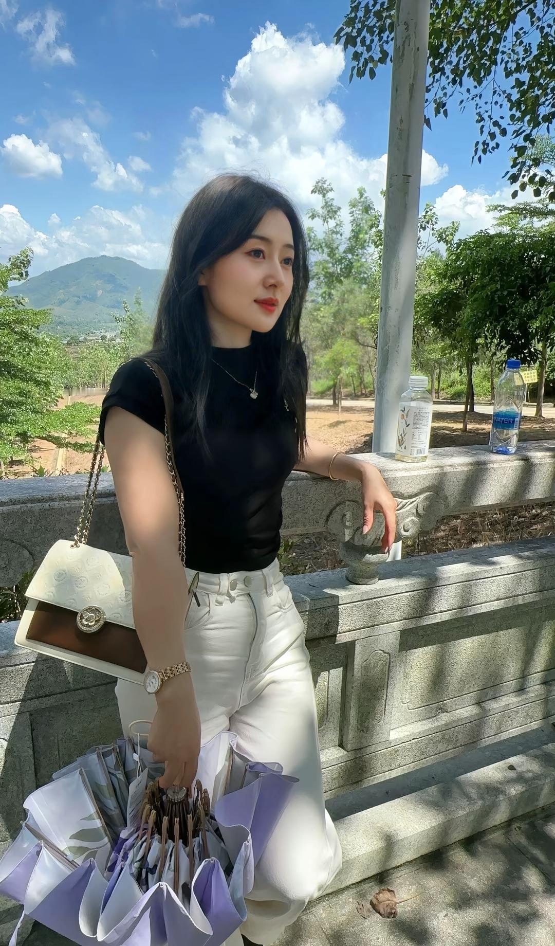 夏日清新穿搭,白色阔腿裤搭配黑色上衣,轻松自在,享受阳光下的美好时光。