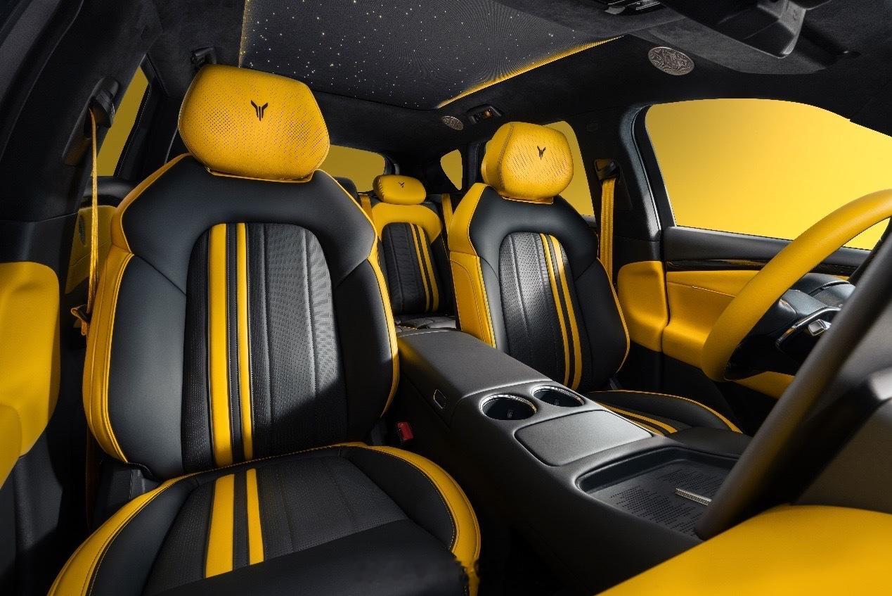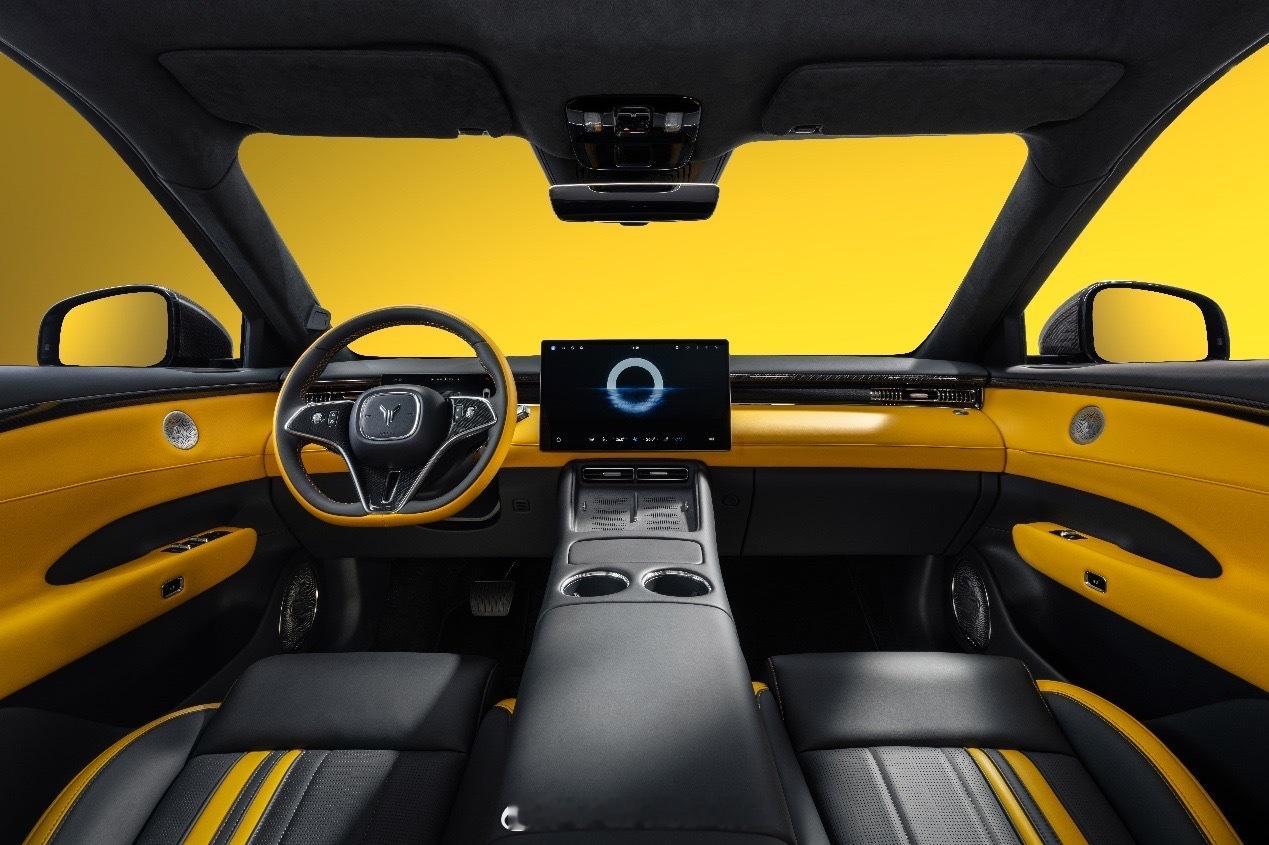 内饰同样上头!玄金双拼撞色+Nappa真皮环抱式座椅,方向盘、门板、顶棚都用了高档麂皮材质。暗影碳纤维饰板、定制黄线缝线,豪华和运动感这次都没拉下。还可以选装“智慧星空顶”,一句话唤醒十二种星河模式,浪漫直接溢出车顶。