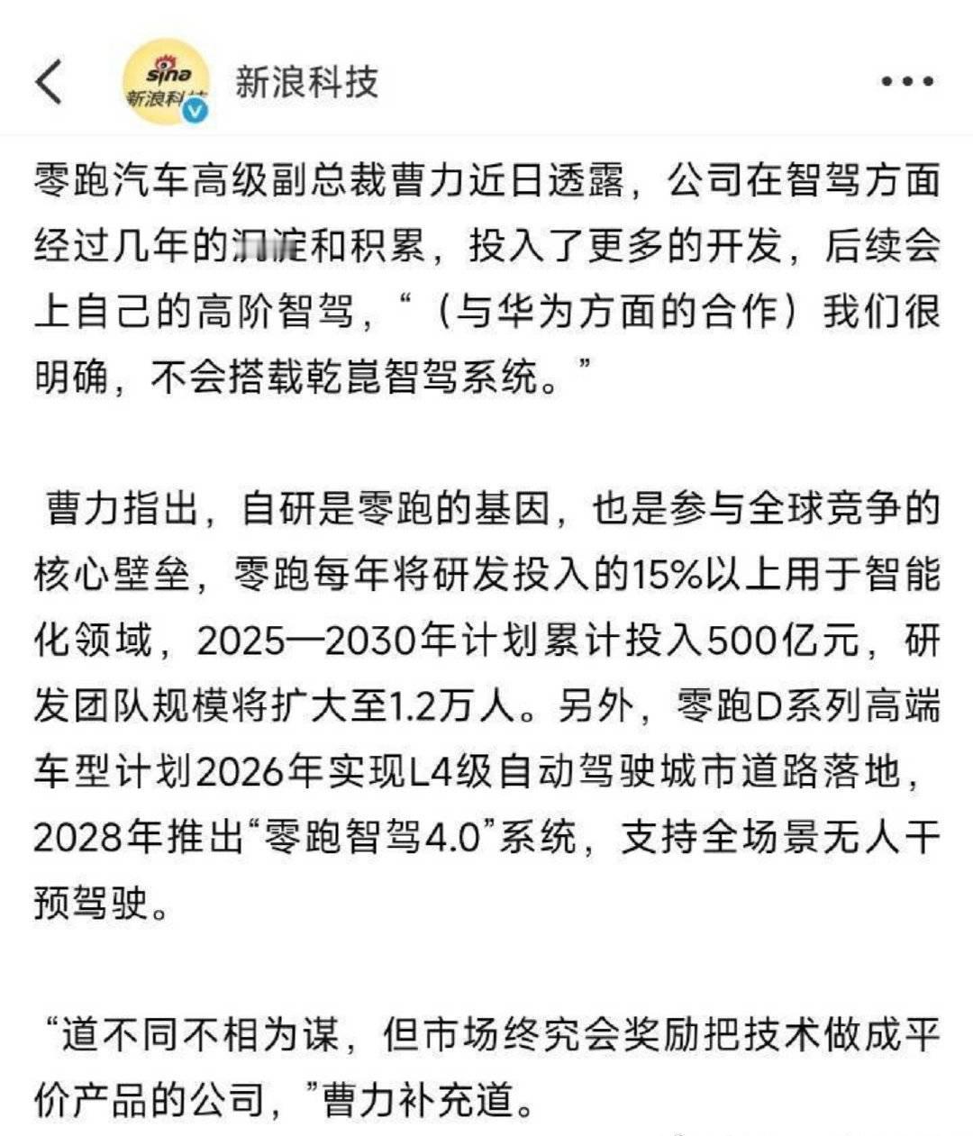 道不同不相为谋!华为和零跑?这传的有点离谱了啊!(图3) 逼得零跑高管(图1)和大V(图2)都出来辟谣了。 零跑在车圈还是非常老实一孩子,安安稳稳也不搞噱头不引战,结果遭受这种无妄之灾,这难道就是强者的必经之路吗? 希望车圈大家能携手共进,把自主品牌做成全球霸主!【来自懂车帝车友圈】