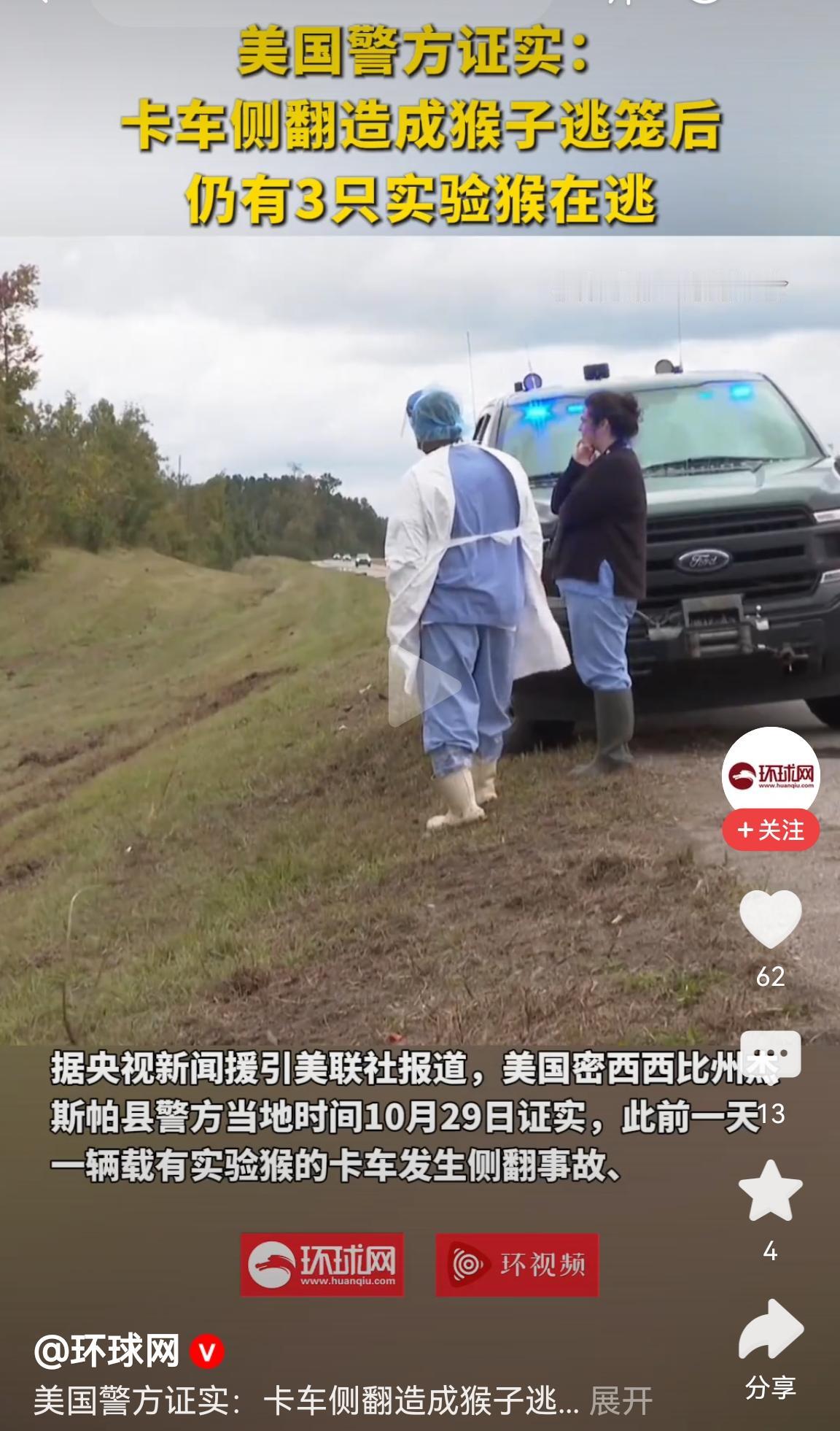每年冬天必上节目, 老美实验室的猴子又跑了。 前两天就奇怪, 我们北方都快送暖气了,今年这老美的猴子怎么还没跑? 今天一看新闻,果然…… 又是熟悉的画面:冬天来了、运输车翻了、猴子跑了、带不带病毒你们猜去吧。[狗头]