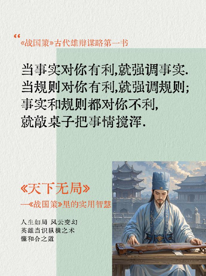 读懂《战国策》里这六句话,你将少走10年弯路,人生更像开了上帝视角。下面这六句话,全是《战国策》里的实用智慧智囊。比如,当事实对你有利,你就强调事实;当规则对你有利,就强调规则;事实和规则都对你不利,就敲桌子把事情搅浑。看完之后,不得不说真的让人感慨万分,真是话糙理不糙,建议大家保存下来,没事多读一读《战国策》,这是古代雄辩谋略的第一书,不管是大人还是小孩,都值得一读。#寻美三湘##长沙新朋友# 少年战国策漫画版 为官从商孩子必懂的生存铁律与传统思维