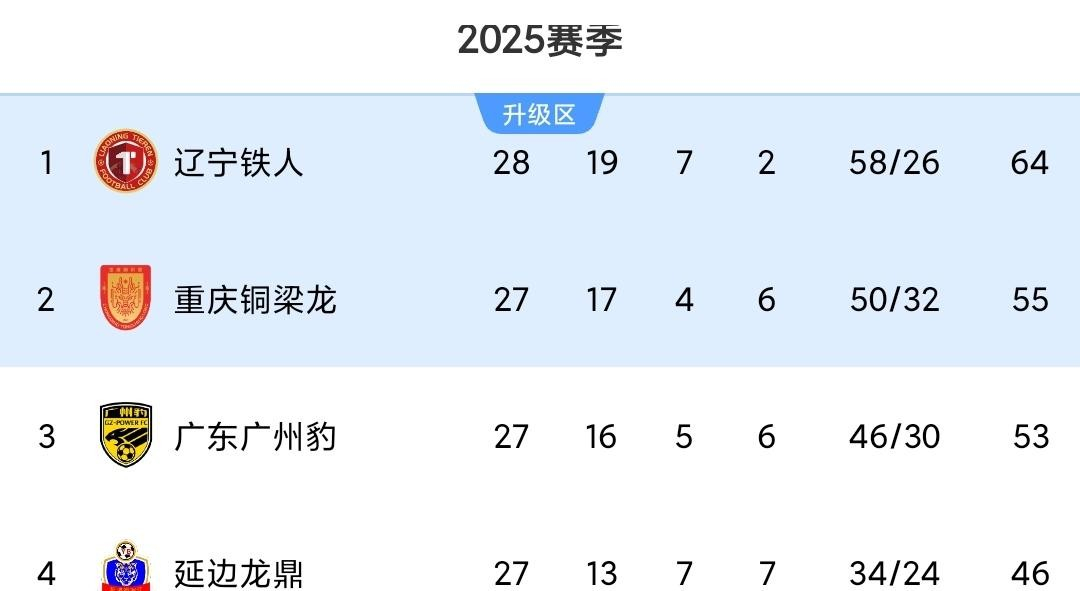 在主场1-0力克南通支云后,辽宁铁人将联赛积分提升至64分。至此,在联赛仅剩两轮且少赛一场的情况下,球队已领先第三名广东广州豹11分,不仅提前锁定升超资格,也将一张中超入场券稳稳收入囊中。