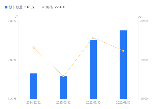 日期A股户数(户)流通A股户均持股数(股)户均持股市值(万元)2025-09-30261006777.9315.182025-06-30241297331.5918.892025-03-311667010612.1216.822024-12-311726110248.7723.812024-09-301196114790.0715.132024-06-301267413958.0212.512024-03-311516911662.2112.602023-12-311350413100.1215.222023-09-301227514411.7316.992023-06-301306113544.4516.65
