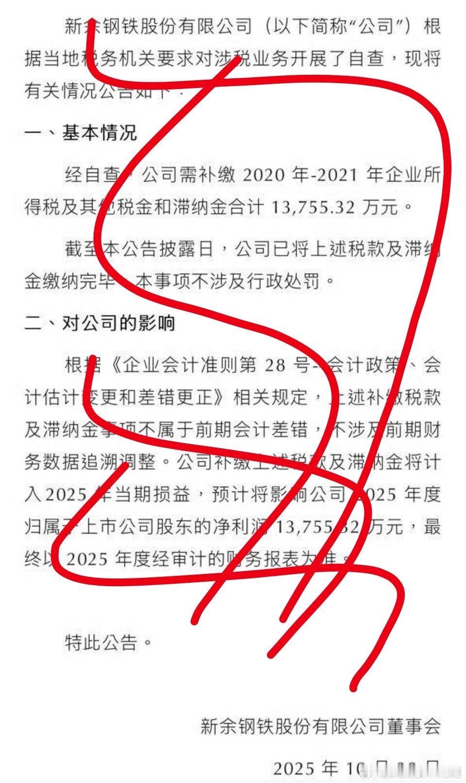 新余钢铁股份有限公司补缴2020-2021年税款及滞纳金13775.32万元?好家伙一个小目标,这和之前虞书欣家的事没关系吧?好像时间不重合。