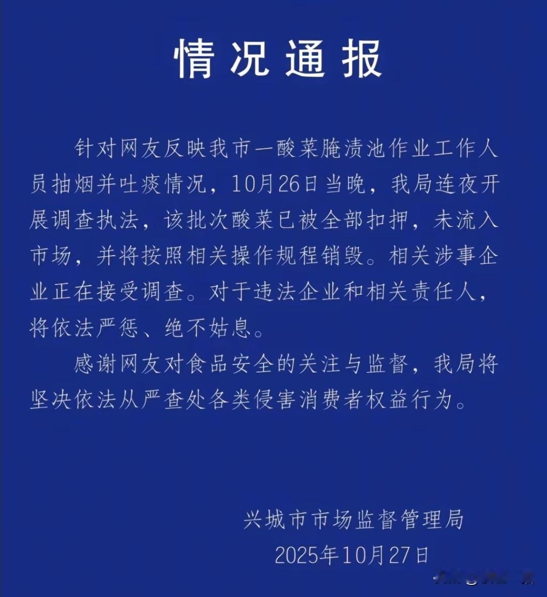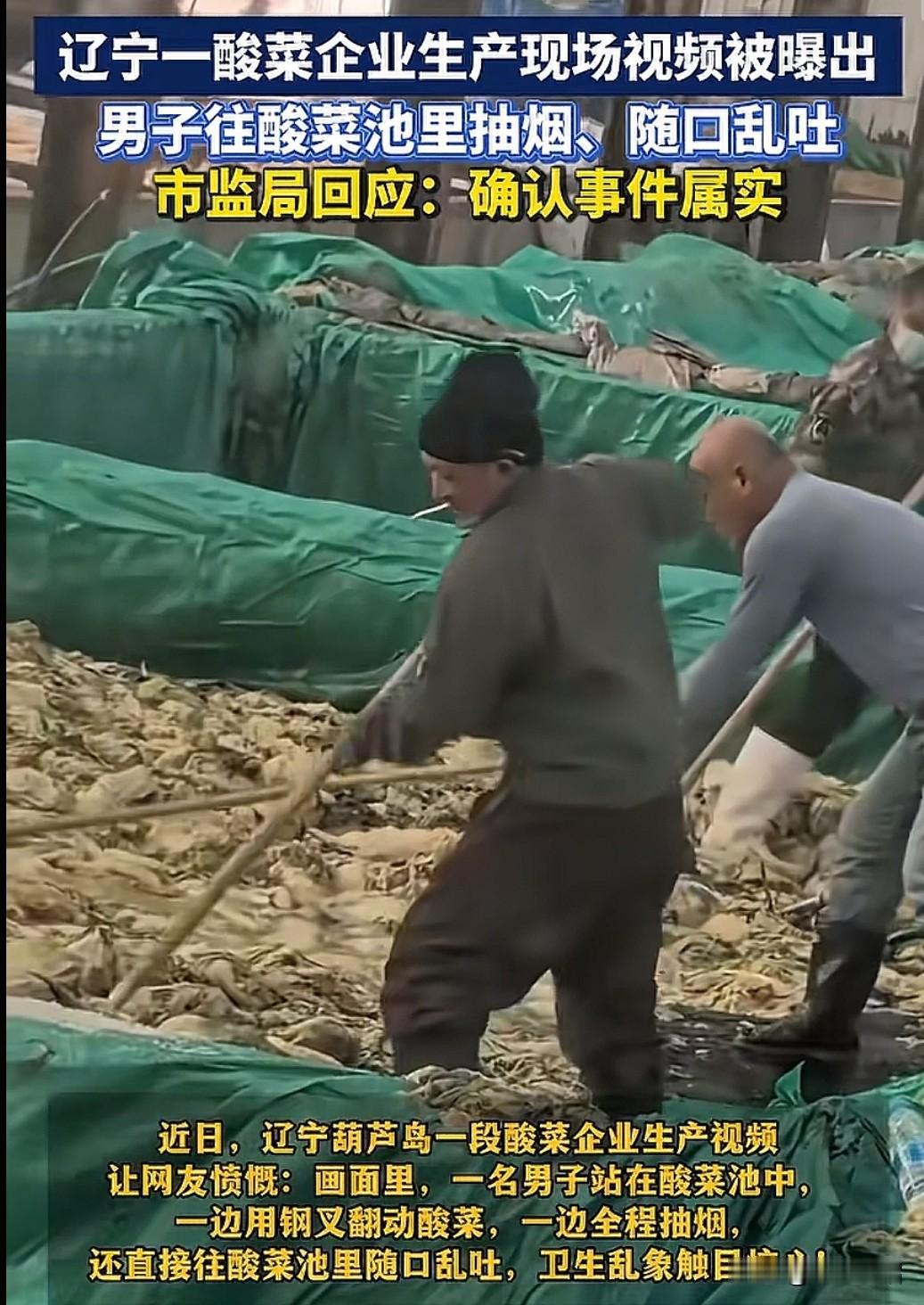 酸菜又出事了,葫芦岛一个企业在酸菜腌渍池里面,一个工人正在操作着酸菜一边抽着烟,一边往腌渍池里直接吐痰。 我就问你恶不恶心,前两年酸菜刚出过一次安全事件的问题,315曝光的某个品牌的老坛酸菜牛肉面,自从那个事情出来之后,我再也没有在外面吃过酸菜。 现在看这个新闻,我的决定绝对是明智的,酸菜生产的过程中就对卫生的要求特别高,更何况有的工人他就没有这样的一个素质和意识。 那你想想你吃进肚子里的酸菜到底是什么,官方的通告已经出来了,说这一批酸菜已经扣下了,我想问一下,只有这批酸菜是这个样子嘛,酸菜简直是食品塌房的一个重灾区。
