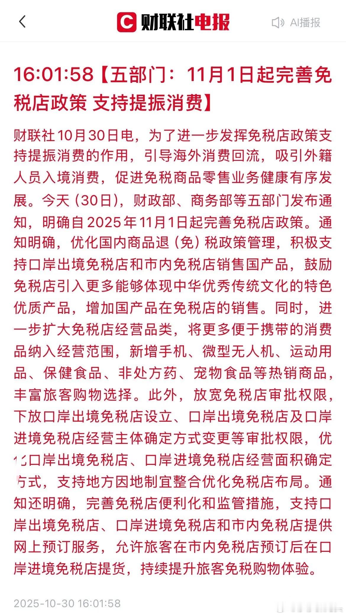 今日,商务部、财政部等五部门联合发布《关于完善免税店政策的通知》,明确自11月1日起实施新一轮免税政策优化!