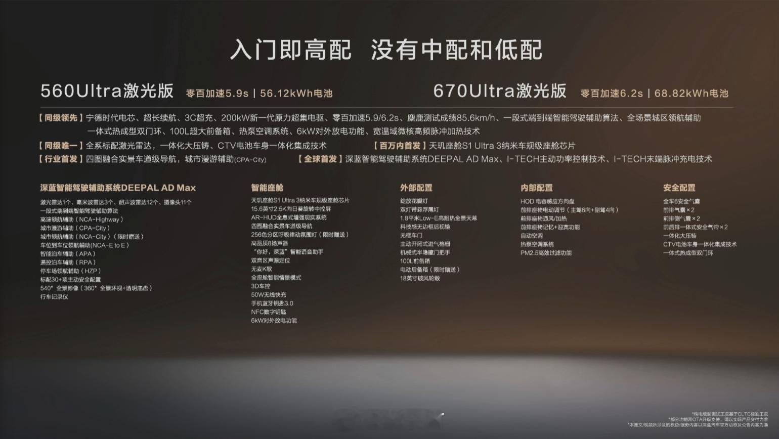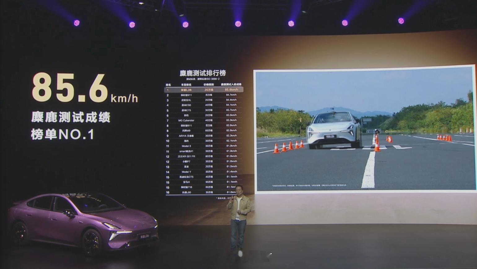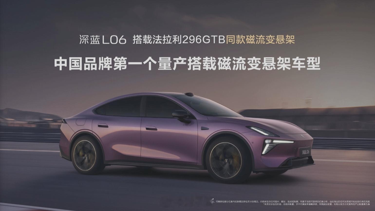 深蓝L06 定位年轻智能轿跑,搭载 3nm 车规级芯片,法拉利同款磁流变悬架,麋鹿测试 85.6km/h。全系标配宁德电芯、金钟罩电池和激光雷达,使用一段式端到端算法,续航长达 670km。