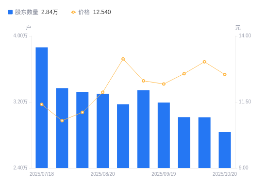 日期A股户数(户)流通A股户均持股数(股)户均持股市值(万元)2025-10-202835214883.5218.662025-10-103014513998.2618.232025-09-303016513988.9817.582025-09-193192513217.7816.102025-09-103341312629.1415.532025-08-293172013303.2017.472025-08-203300112786.8115.182025-08-083323112698.3114.112025-07-313367312531.6313.522025-07-183862310925.5512.47