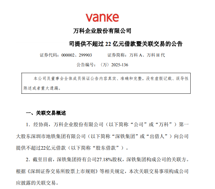 10月30日,万科A(000002)公告称,公司第一大股东深圳市地铁集团有限公司(以下简称“深铁集团”)向公司提供不超过22亿元借款,用于偿还公司在公开市场发行的债券本金与利息。