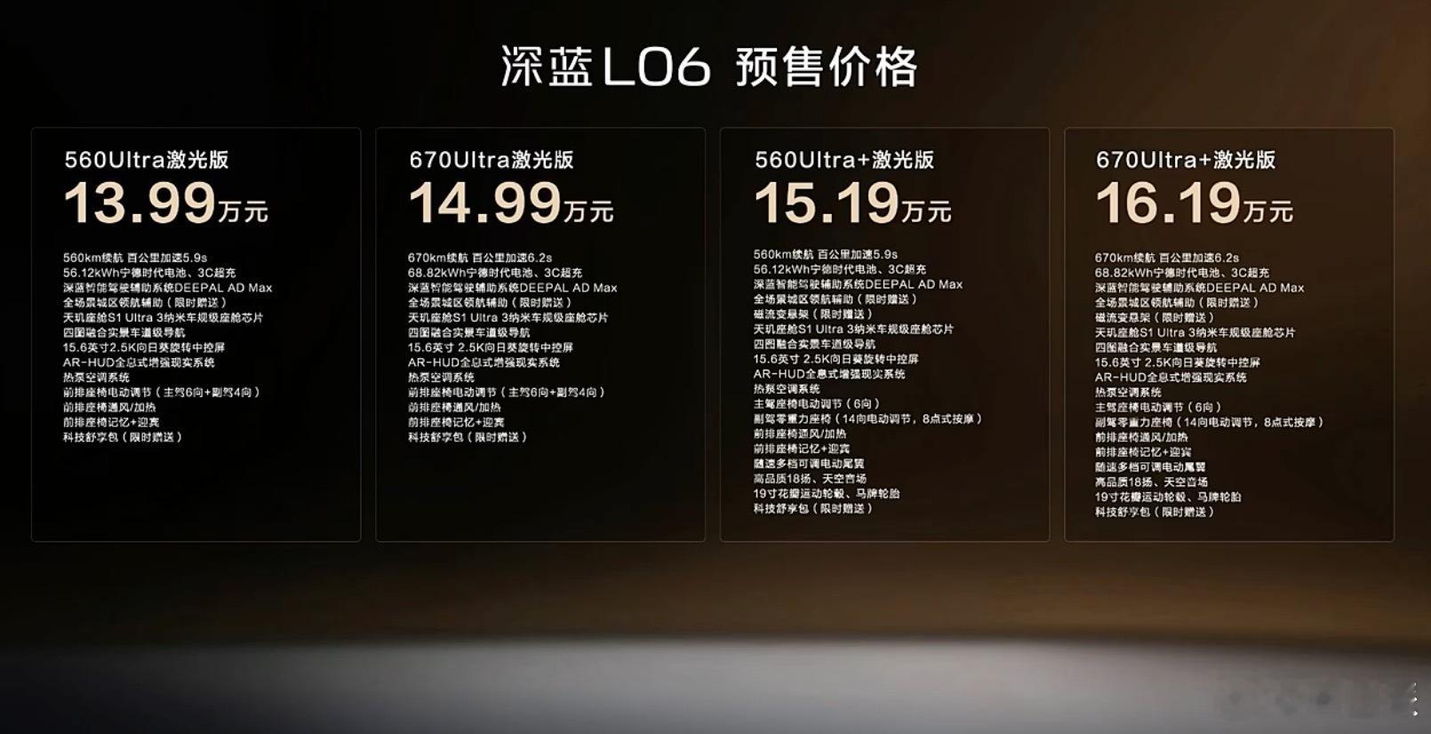 先看底盘,300万法拉利同款磁流变悬架,飞坡不跳、过弯不偏,真·公路磁悬浮;再看芯片,3nm车规级天玑S1 Ultra座舱芯片,百万内唯一一台,丝滑到像在刷苹果;智驾上,全系标配激光雷达+端到端算法,体验超越特斯拉;电池更狠,全系宁德时代电芯+金钟罩电池,670km长续航,两周只充一次电。关键是,没有中配低配,入门即高配。别人眼里的“离谱配置”,在深蓝L06这,就是“靠谱底气”。这波,深蓝真把年轻人的Dream Car造明白了。深蓝L06用众多离谱造就超级靠谱深蓝L06入门满配预售价13.99万
