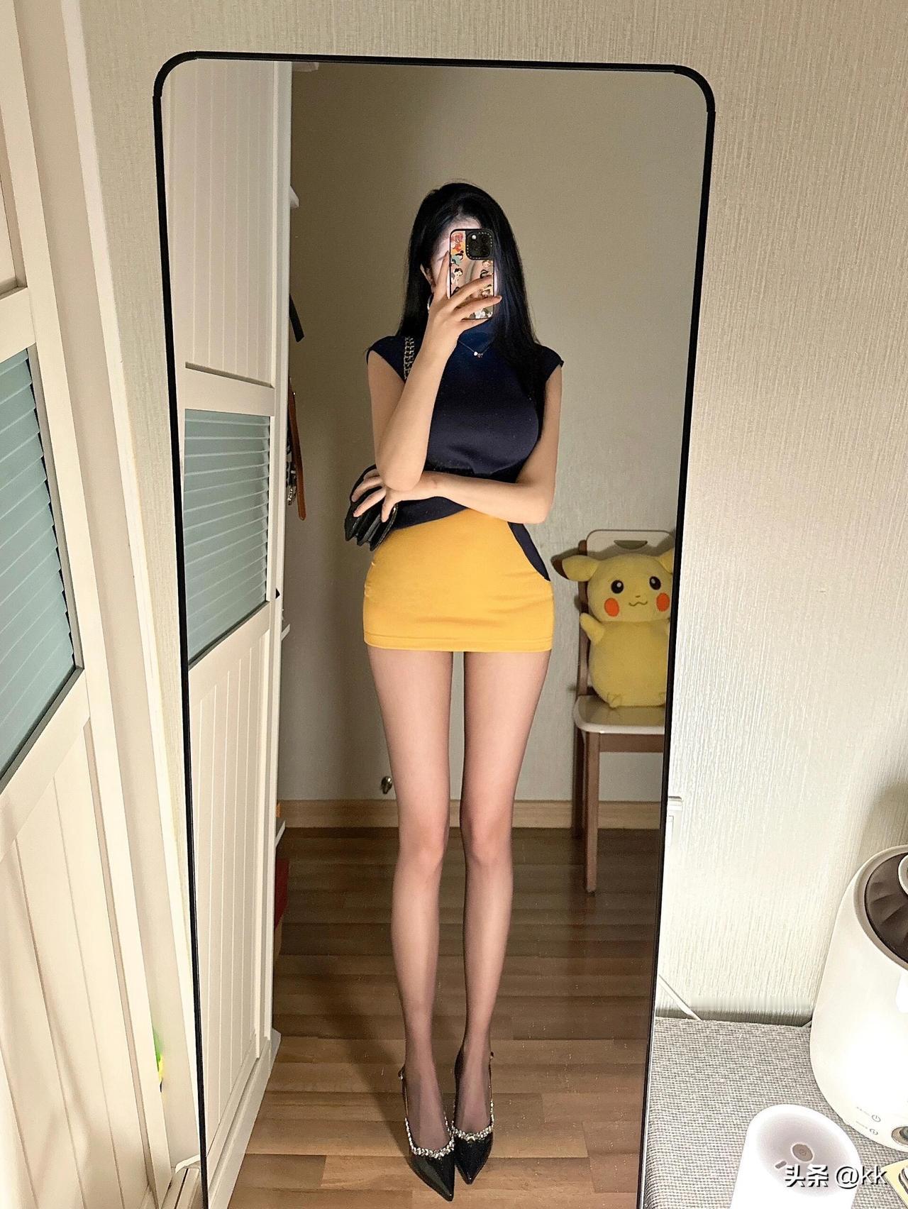 宝子们!今天这套撞色穿搭我能吹爆!藏蓝上衣+亮黄色包臀裙,视觉冲击力绝了,瞬间把
