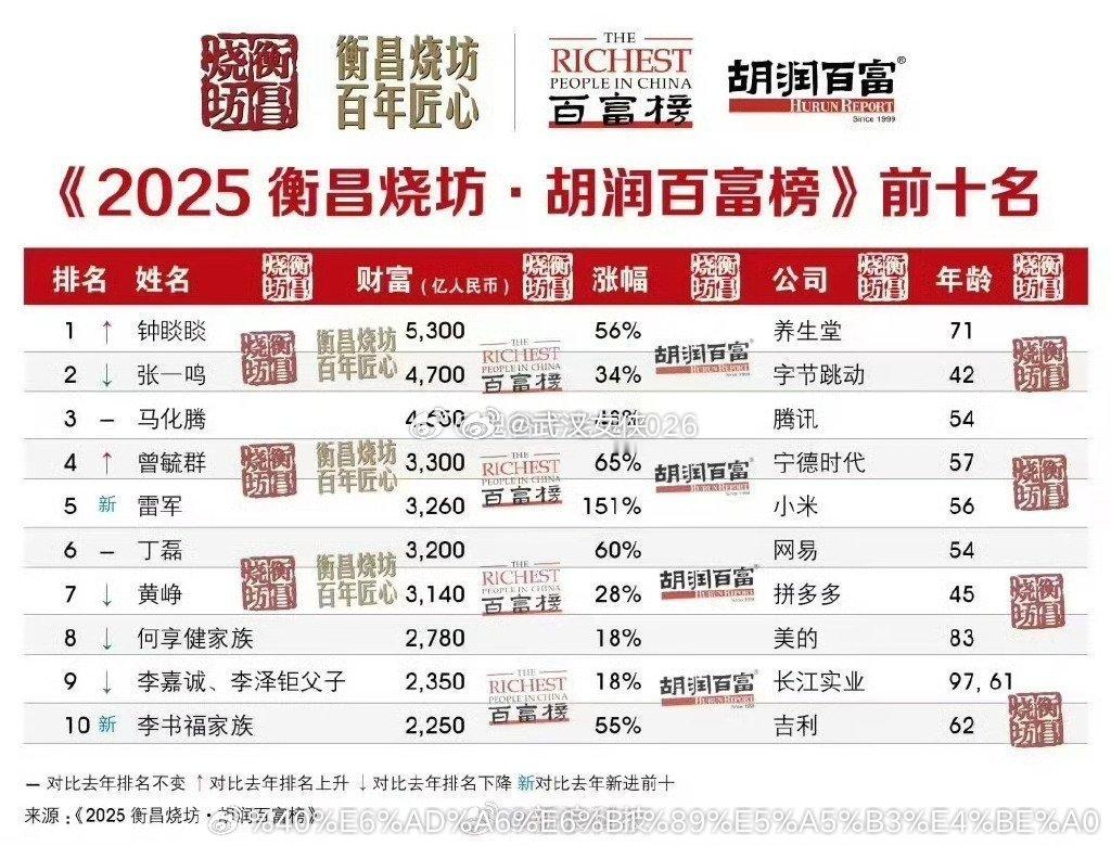 胡润富豪榜出炉,钟睒睒依然是中国首富,资产5000亿。张一鸣(字节跳动)排名第二,4700亿,马化腾排名第三,4650亿。曾毓群(宁德时代)排名第四,3300亿。