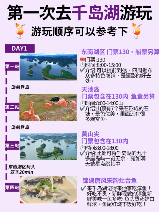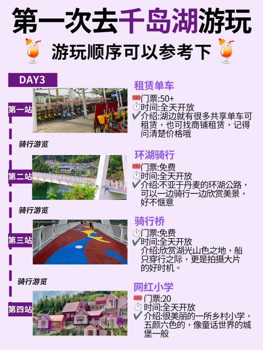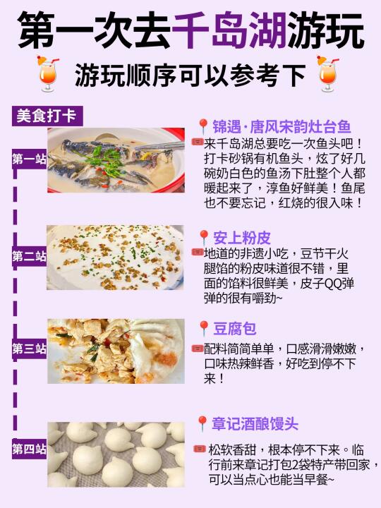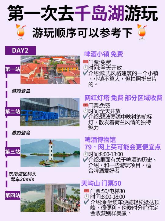 去过千岛湖N次整理的游玩攻略! - ✅DAY1:湖区码头坐船-黄山尖-天池岛-锦遇吃淳鱼 ✅DAY2:啤酒小镇-网红灯塔-啤酒博物馆-骑龙巷 ✅DAY3:租赁单车-环湖骑行-骑行桥-网红小学(或者直接回酒店) - 🧾免费景点打卡 芹川古镇 淳安博物馆 千岛湖广场 骑龙巷 啤酒小镇 梦姑塘观景台 - 🍖千岛湖美食打卡 📌锦 遇 ·唐 风 宋 韵 灶 台 鱼 📌安 上 粉 皮 📌豆 腐 包 📌章 记 酒 酿 馒 头 -