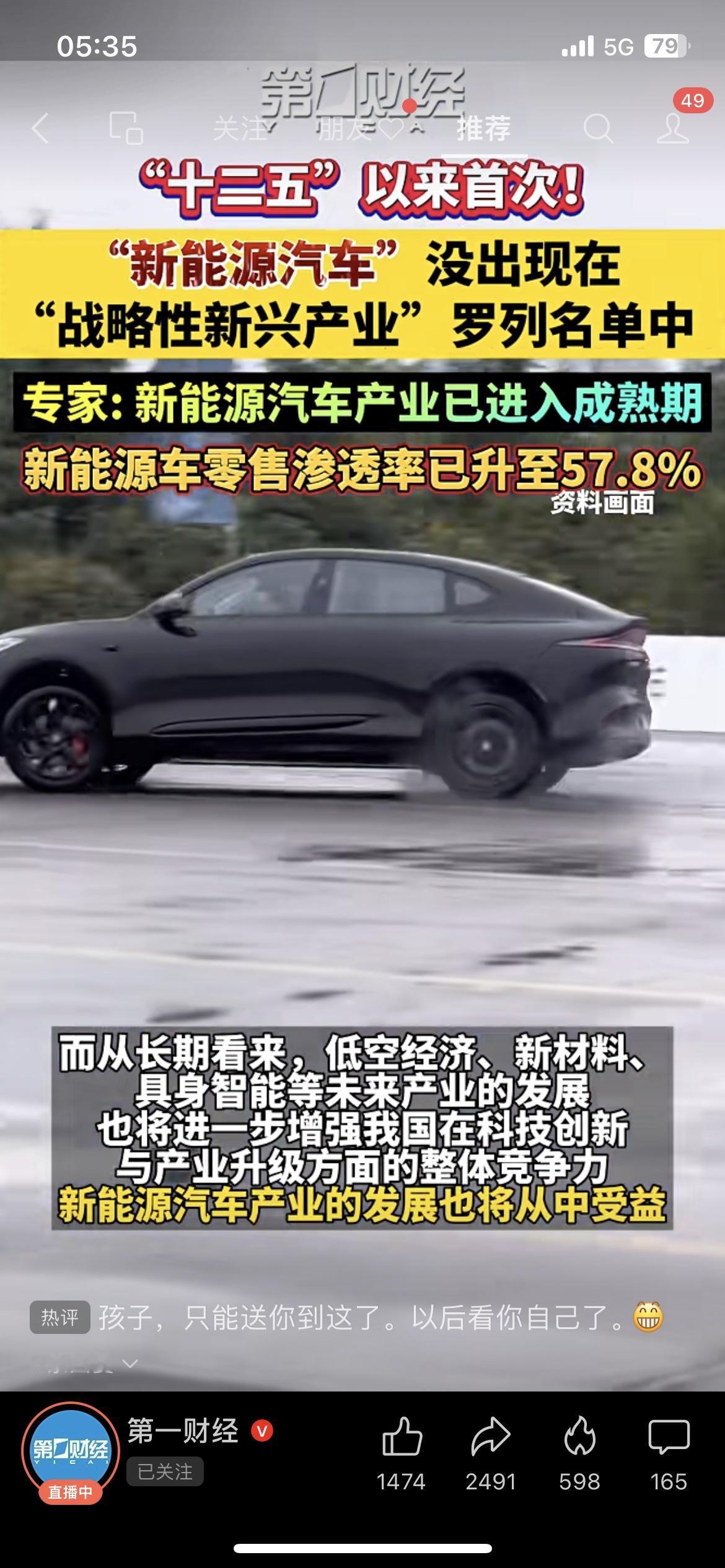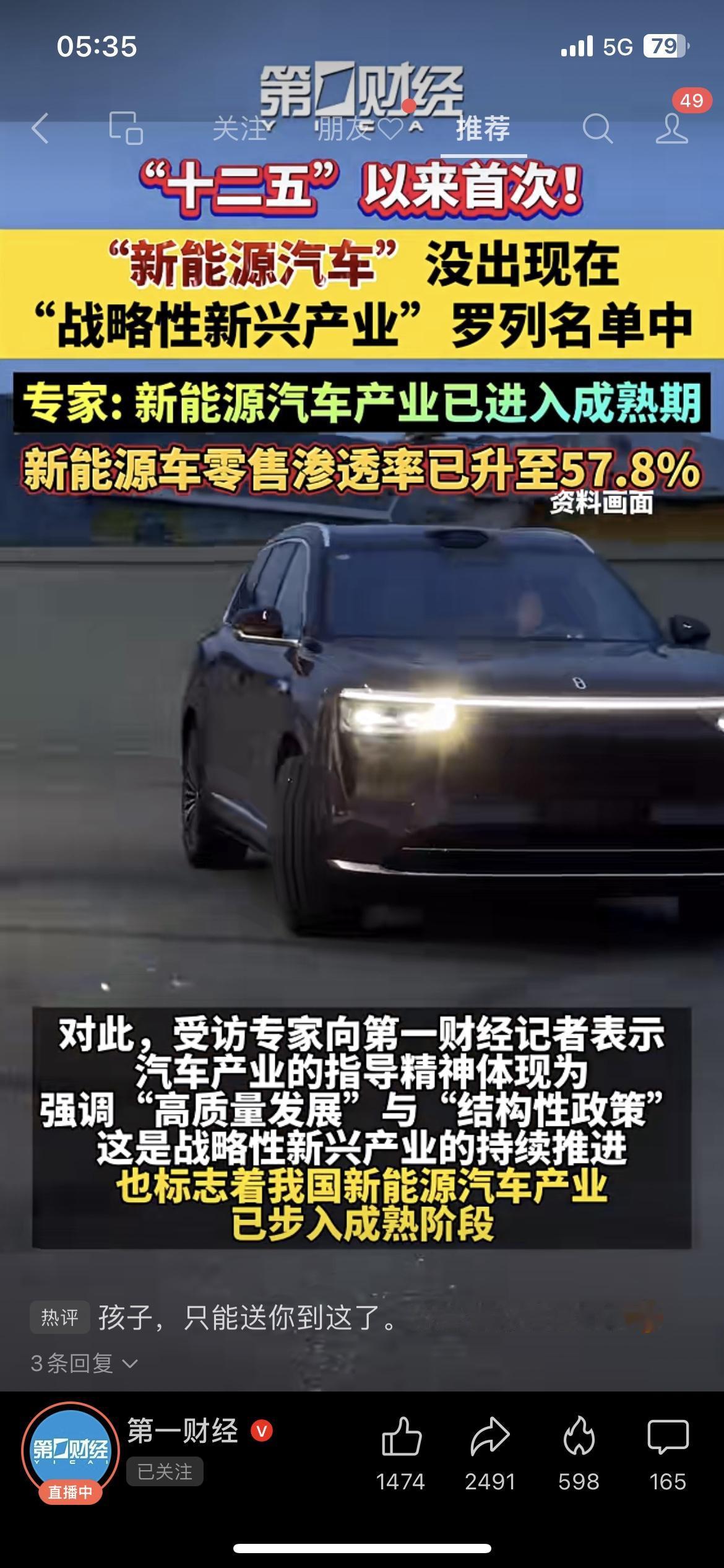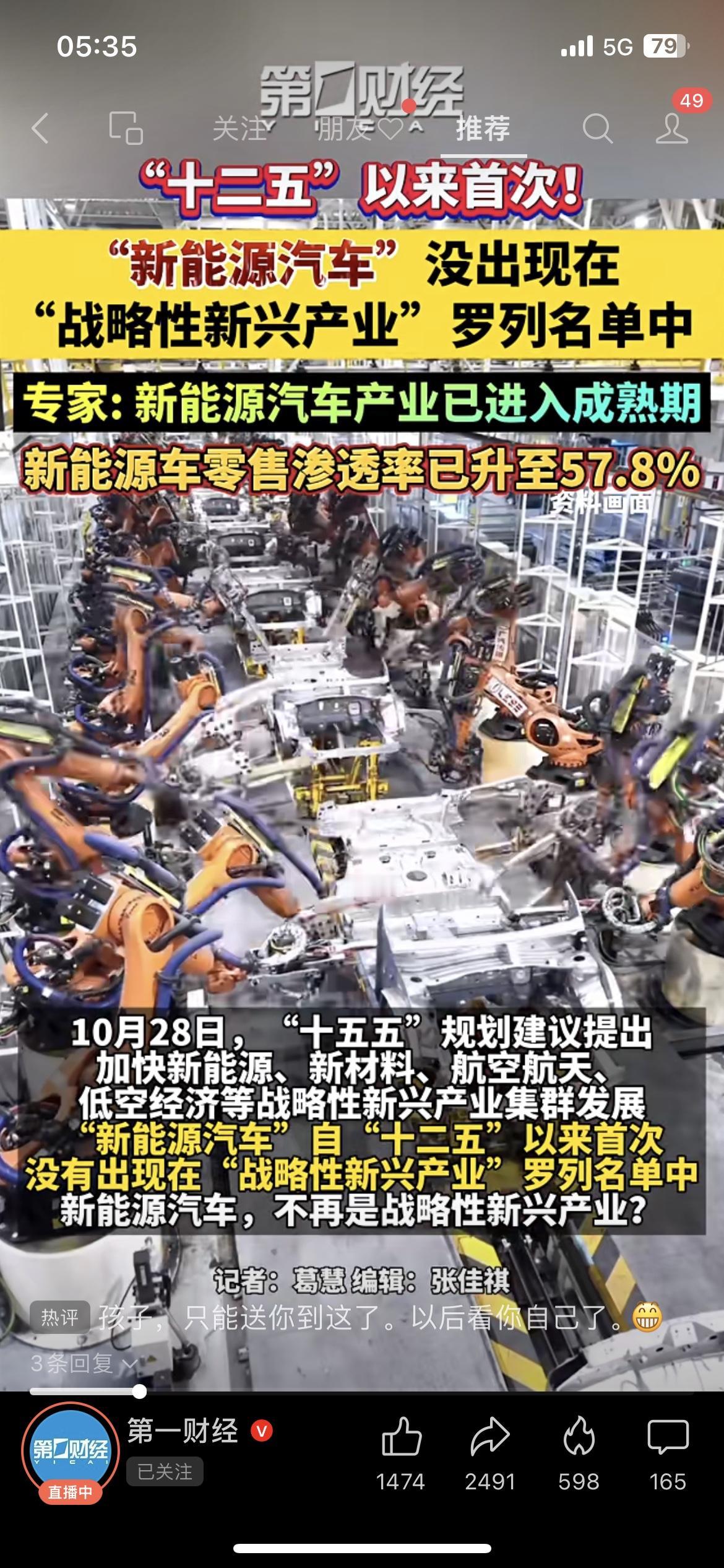 十五五”首炸!新能源汽车被移出战略名单 刚官宣的“十五五”规划直接炸了!新能源汽车从“十二五”起,头回被踢出战略性新兴产业名单。 现在新能源车零售渗透率都飙到57.8%了,专家说这行业算彻底“成年”了。你说这是产业“毕业”,还是政策要“松手”了? 后续买车的政策红利可能要收窄,近期想入手新能源车的朋友可得多盯盯市场!转给身边打算买车的伙计,一起聊聊这波变动值不值!