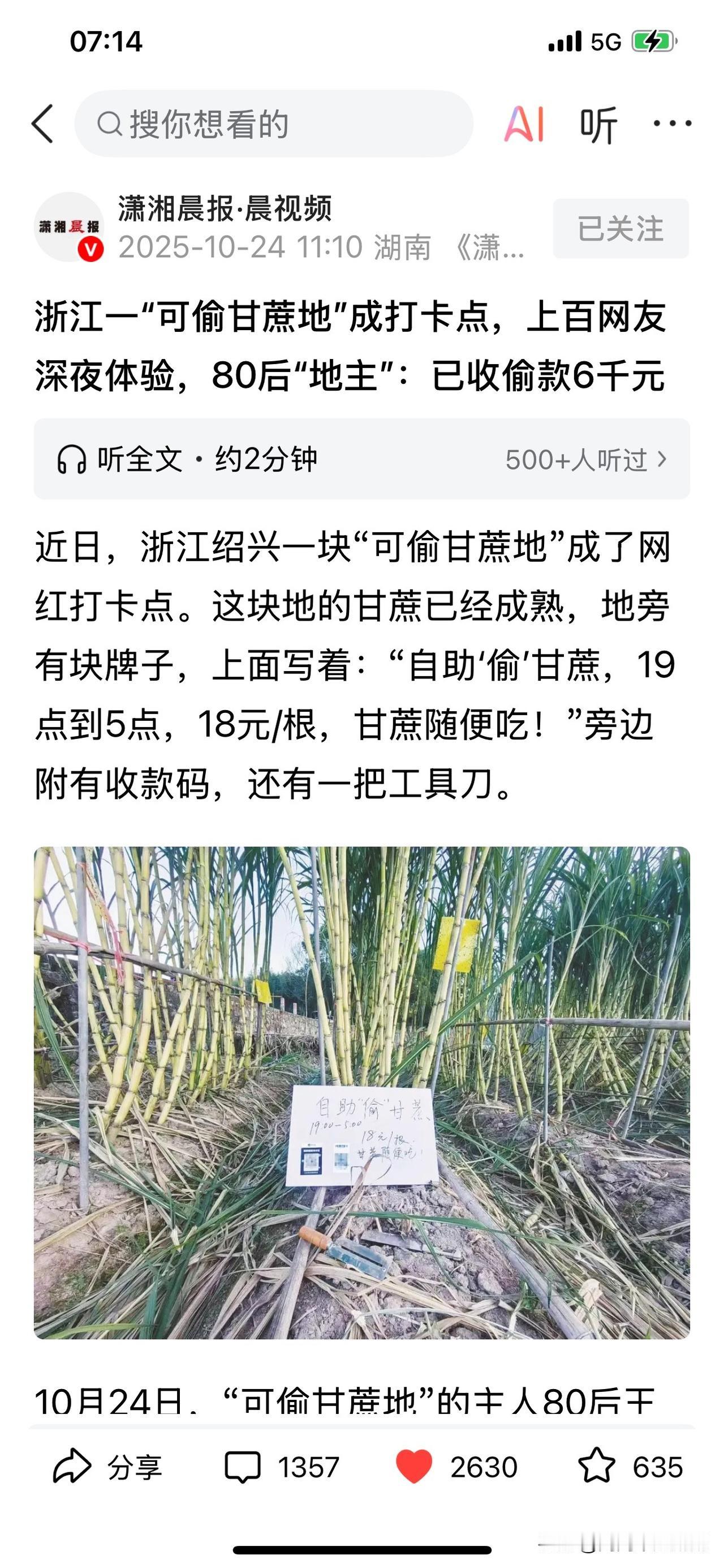 浙江,一“可偷甘蔗地”成打卡点,上百网友深夜体验,80后“地主”:已收偷款6千元。这块地的甘蔗已经成熟,地旁有块牌子,上面写着:“自助‘偷’甘蔗,19点到5点,18元/根,甘蔗随便吃!”旁边附有收款码,还有一把工具刀。 王勇龙是个80后,前段时间地里的甘蔗熟了,他在网上发了推介视频,有网友留言说“好久没体验过小时候偷甘蔗的乐趣了,好想来一次”。这句话一下子点醒了他。 王勇龙觉得这主意有意思,立马动手做了块牌子立在地边。他想着,大家要是觉得不好意思,放个付款码能自在些。没想到,牌子立了才二十多天,竟来了一百多人。 来的人大多挑晚上,打着手电筒在蔗叶间猫着腰选甘蔗,砍完还不忘就着月光扫码付款。王勇龙说,这段时间已收到六千多块“偷款”。地里还长着一千多根甘蔗,这份特别的“偷”趣还在继续。 网友们有人说“这‘偷’来的甘蔗嘎嘎甜”,有人调侃“付一根吃三根”,还有人笑称“做了一次不用紧张的贼”。也有人觉得18元一根有点贵,王勇龙倒很实在,回应说甘蔗是用玫瑰酵素种的,若觉得贵,免费吃也行。为了让夜间的体验更有味道,他最近还在田边布置了灯光。 这块地之所以让人着迷,大概是精准唤醒了很多人心底的乡土记忆。更难得的是在“想付就付,不想付也能拿”的宽松规则下,大多数人选择了主动付款,陌生人间这份自觉与诚信,让这“偷”来的甘蔗格外甜。 王勇龙自己也没太较真,他觉得大家想付钱就付,不想付钱拿了甘蔗走也行。这份信任,反而让每个走进这片甘蔗地的人,都格外珍惜这次体验。 各位读者你们怎么看?欢迎在评论区讨论。