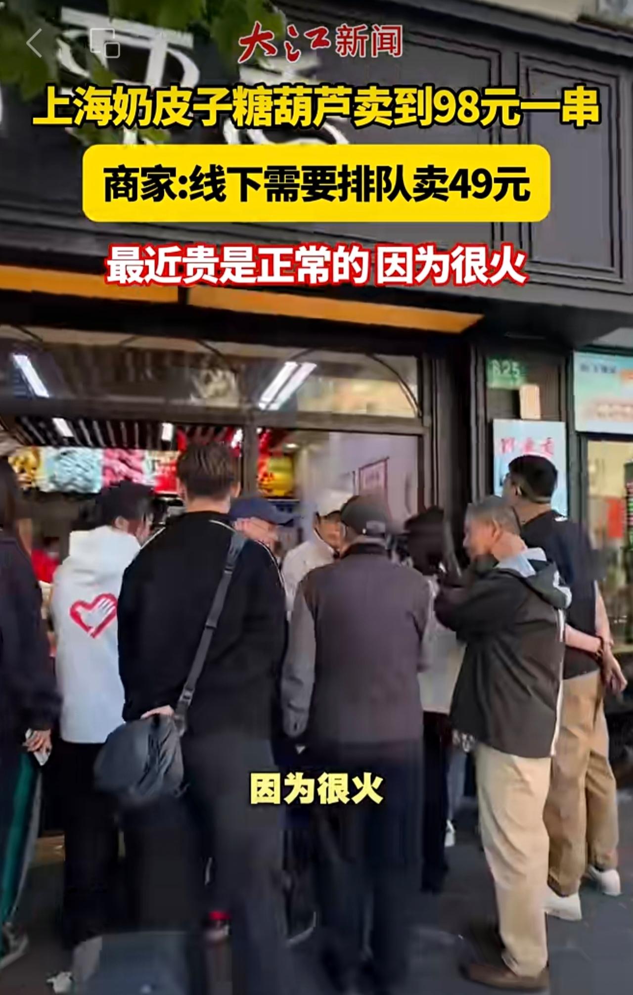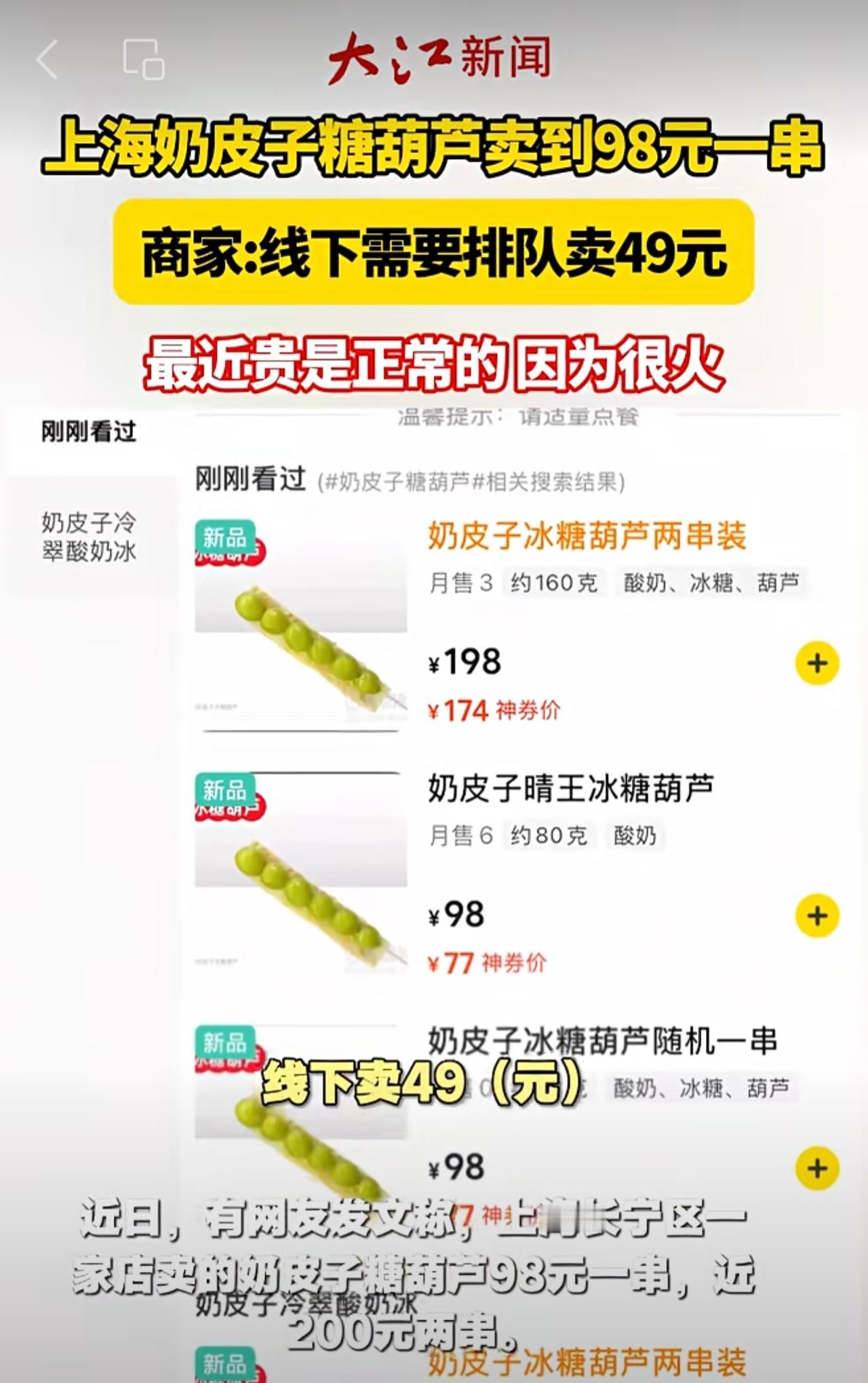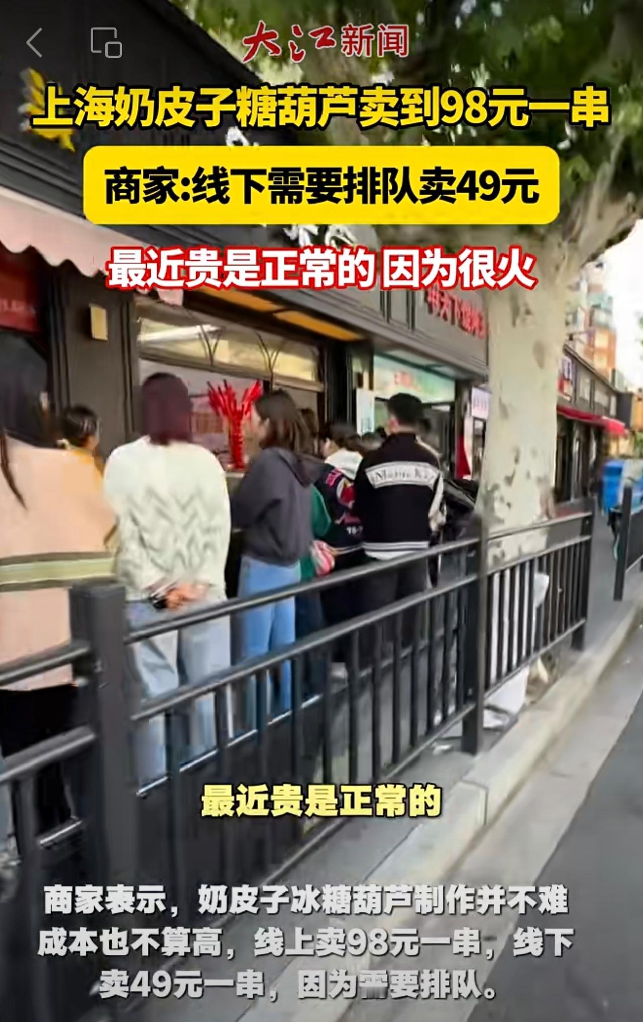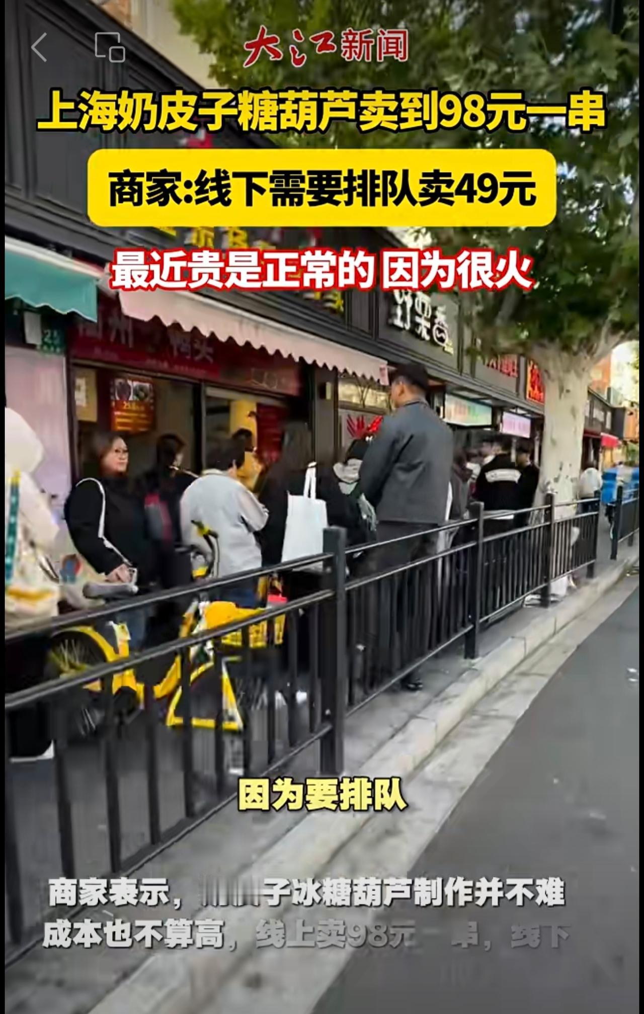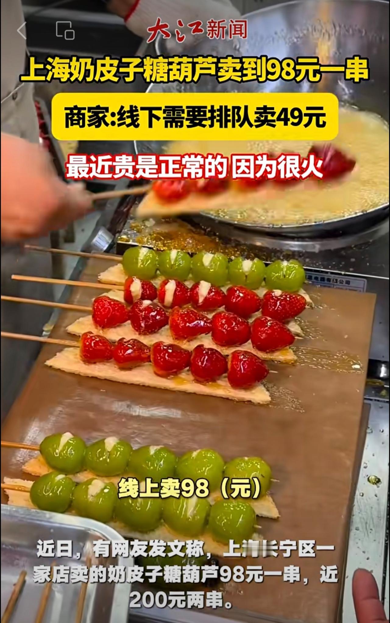 上海奶皮子糖葫芦卖到98元一串,商家:线下需要排队卖49元,最近贵是正常的,因为很火