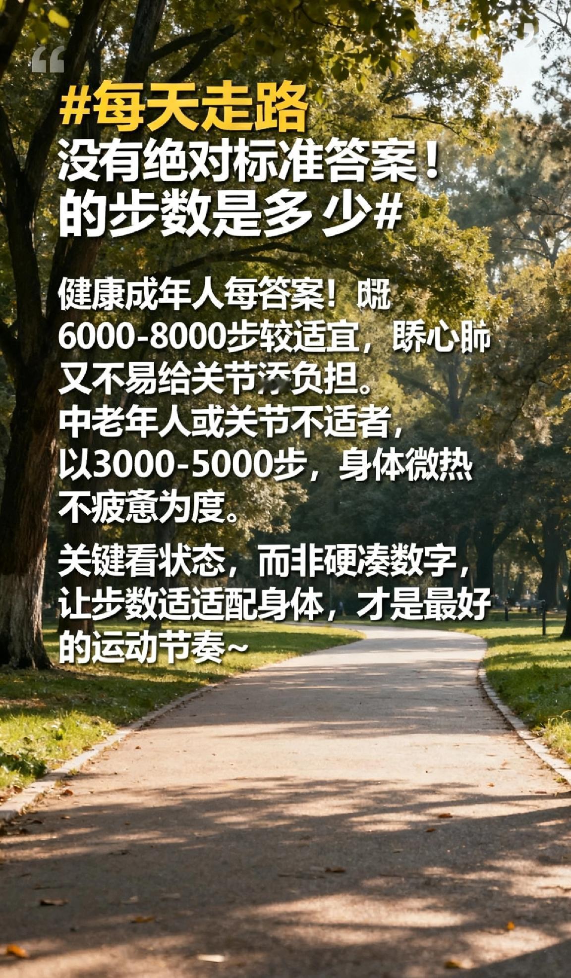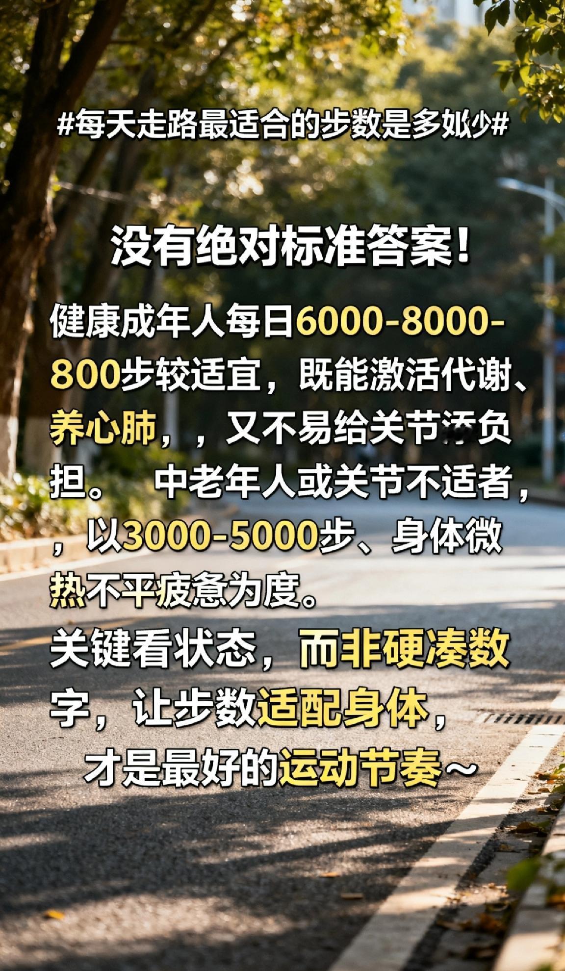 没有绝对标准答案!健康成年人每日6000-8000步较适宜,既能激活代谢、养护心肺,又不易给关节添负担;中老年人或关节不适者,以3000-5000步、身体微热不疲惫为度。关键看状态,而非硬凑数字,让步数适配身体,才是最好的运动节奏~健康走路方法 50分钟快走