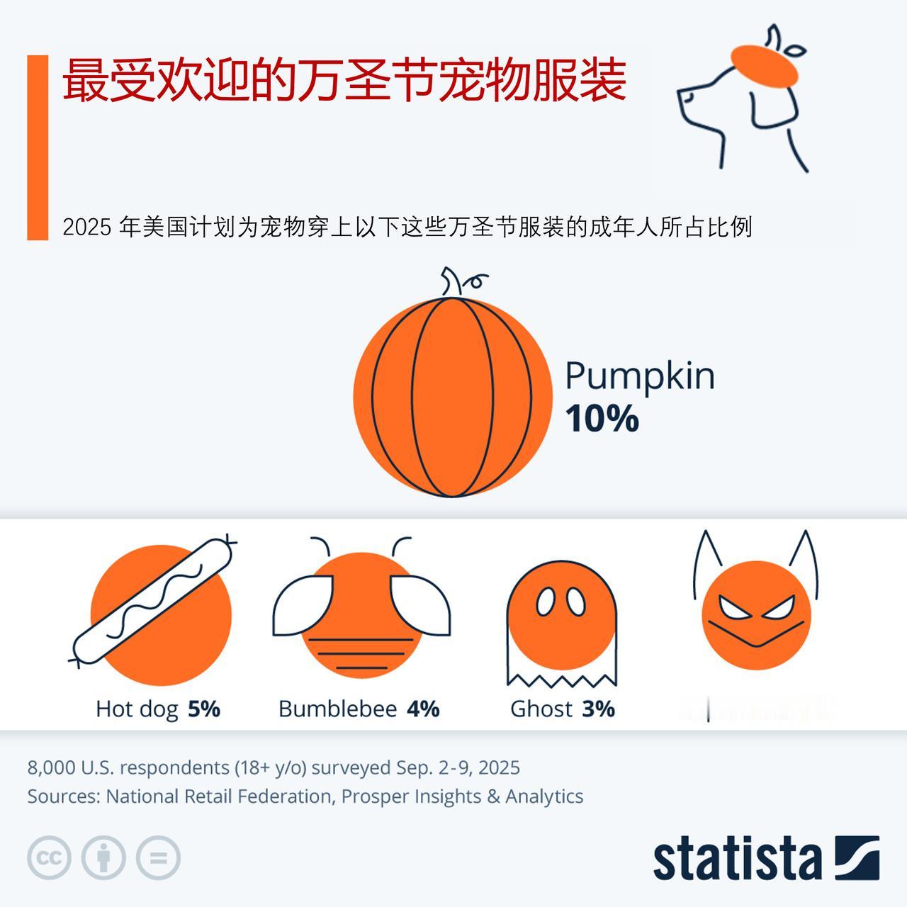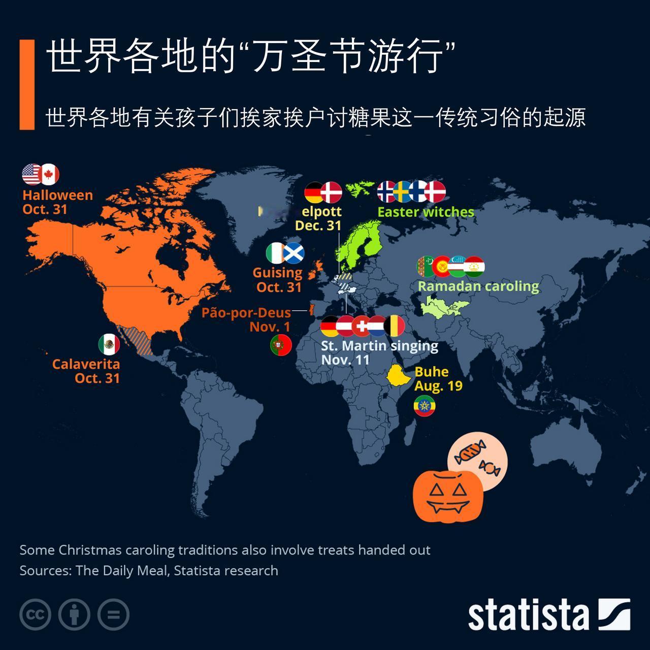 世界各地的“万圣节游行”习俗有什么不同? “万圣节游行”这一习俗自 20 世纪初起就在美国和加拿大与万圣节庆祝活动中紧密相连,但世界各地都有孩子挨家挨户寻求糖果的习俗,其中一种欧洲传统被普遍认为是北美这一习俗的前身。 早在中世纪时期,不列颠群岛的民众在节日时会盛装打扮,并挨家挨户表演节目,以此来换取食物和饮料作为感谢。这一传统至今在苏格兰和爱尔兰仍以“装扮游行”的形式保留着,其特点是装扮成各种角色而非进行戏剧表演。万圣节(10 月 31 日)的起源可追溯至凯尔特传统,更确切地说是萨温节,这个节日标志着冬季的开始,也是精灵和幽灵需要被安抚的时候。和许多基督教节日一样,圣徒节(11 月 1 日)及其前夕万圣节之夜也与异教节日重合,葡萄牙在 11 月的第一天会进行“万圣节游行”。圣徒节在墨西哥也有重要意义(在那里被称为“亡灵节”),但美国的万圣节传统也被采纳了,在该国北部和中部地区最为盛行,那里这个习俗以“小骷髅”(calaverita)来命名,这是为了这个节日而赠送的糖制骷髅头。 但这种吓人的装扮和“万圣节游行”活动并非只在特定日期举行:在斯堪的纳维亚地区,孩子们会在复活节期间进行这些活动;而在德国北部和丹麦南部,孩子们则会在新年前夜进行此类活动。在德国南部、奥地利、瑞士、荷兰以及比利时的弗拉芒地区,孩子们会在 11 月 11 日(圣马丁节)表演歌曲以换取糖果,而并非因为威胁行为。在中亚地区,唱圣诞颂歌以换取糖果的活动也会在斋月期间举行。这种“万圣节游行”逐渐融入了圣诞节的唱颂歌活动,有时这种活动还会伴随着食物的馈赠,例如在东欧地区。这种习俗与英格兰和美国最为相关,但同时也涉及成人和儿童,通常会进行金钱的募集,例如用于慈善事业。 在美国,万圣节可是件大事。据估计,到 2025 年,普通消费者在与万圣节相关的商品上的花费将超过 100 美元,这无疑是一个价值数十亿美元的产业。 根据 Statista 发布的《美国万圣节报告》,预计的总消费额已从 2005 年的 33 亿美元猛增到 2025 年的近 4 倍之多,预计将达到 131 亿美元。在所有与万圣节相关的商品中,消费者每年在服装上的花费最多,甚至会花在他们的宠物身上。 如下面的图表所示,根据美国全国零售联合会的数据,在为自家宠物准备节日装扮方面,美国成年人最喜爱的服装款式是南瓜装,其次是热狗装、大黄蜂装、幽灵装和超级英雄装。