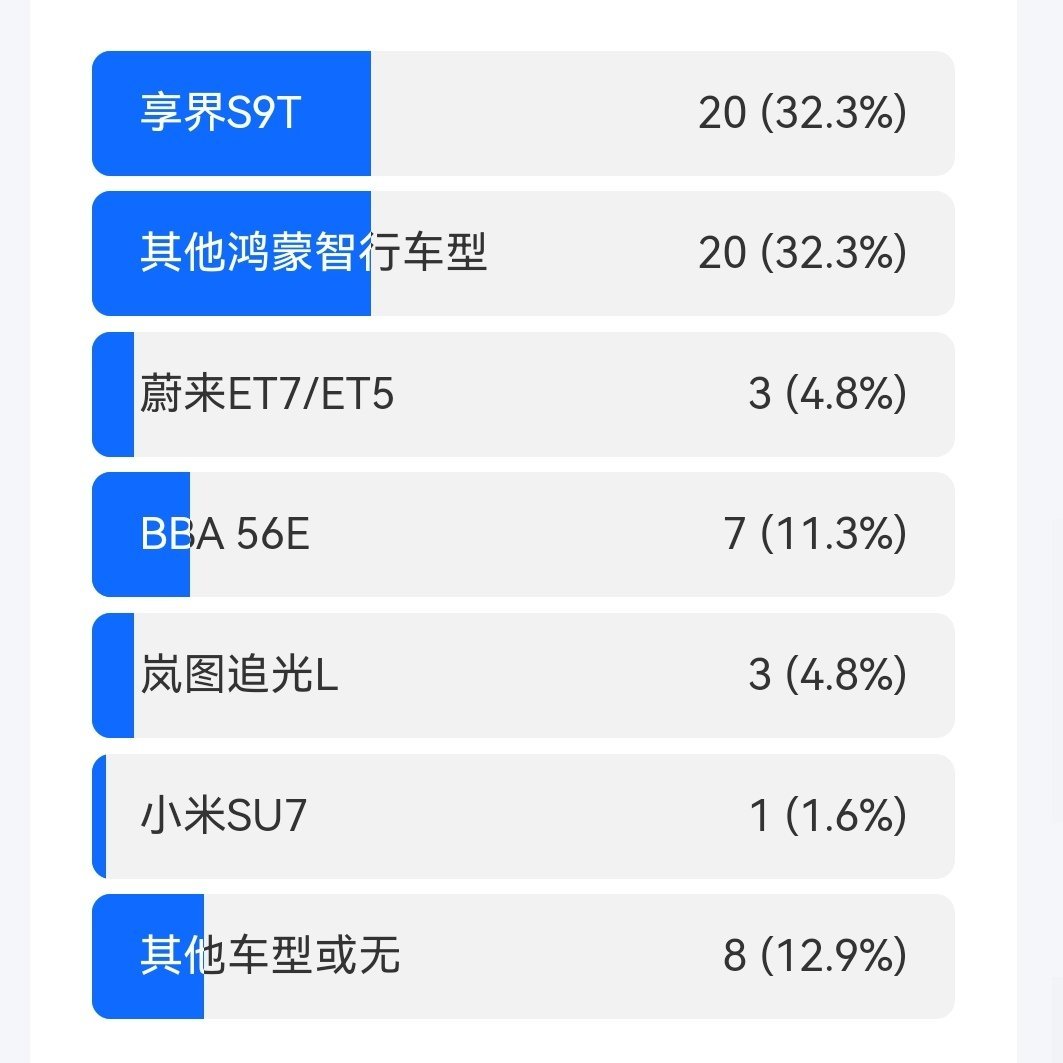 对比车型:S9或者说鸿蒙智行的潜客很难被撬动,只要认准“安全”这条线,只是选择哪个车型的问题。超过65%的消费者对比的是鸿蒙智行自己的车型,其次是BBA的56E。