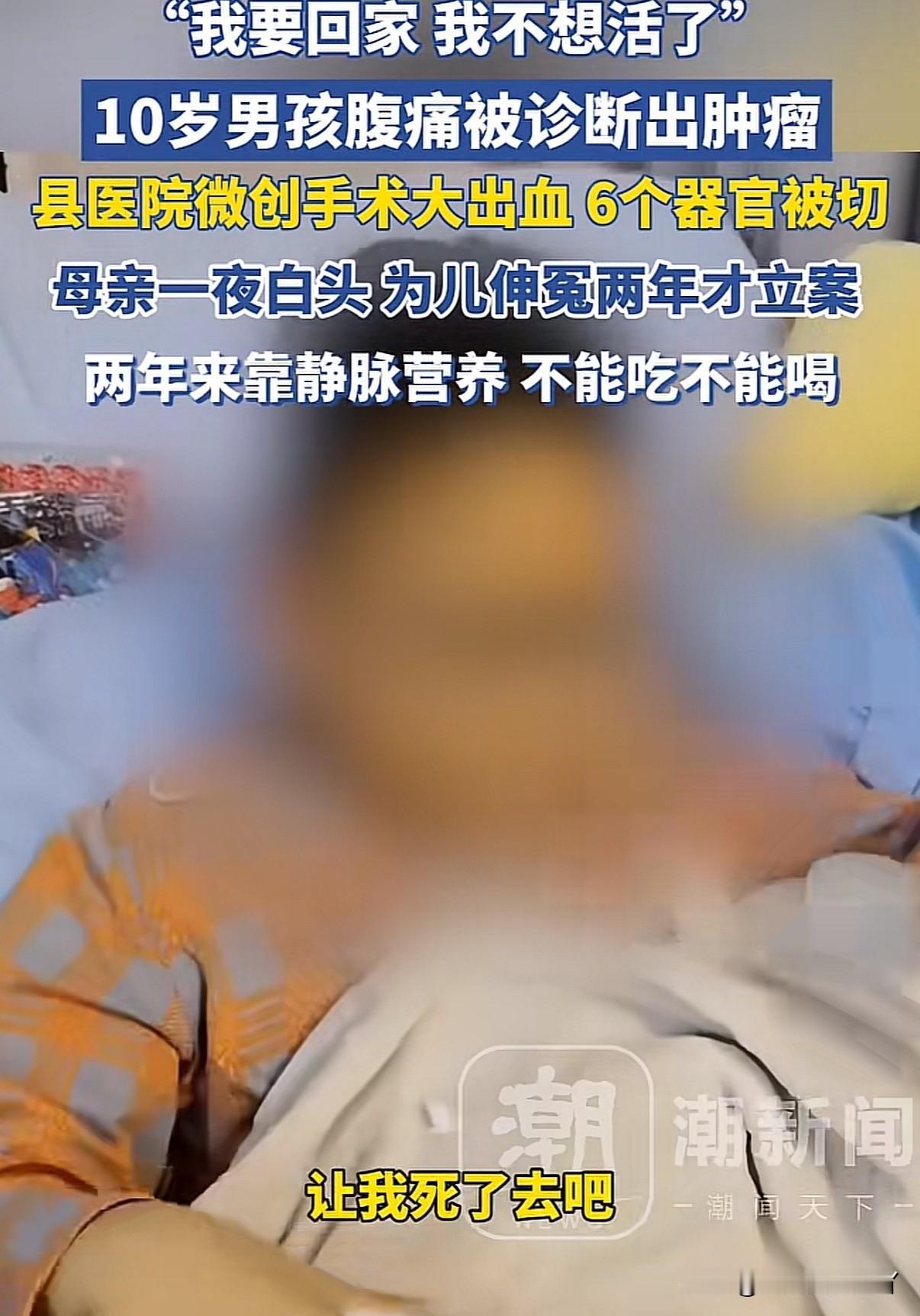 10岁男孩一小手术却被县医院切掉6个器官,整个消化系统几乎被掏空只能依靠注射营养液续命,母亲一夜白头奔走2年终立案 2023年10月山东菏泽读五年级的小烨课间玩耍时撞到肚子引起腹痛,妈妈带小烨前往成武县医院检查,医生也说不是什么大事先住院观察,随着ct报告出来医生说小烨的胰腺与胃之间有一个占位性病变只需做一个微创腹腔镜手术。医生说这只是一个很小的手术家人便也未多想就在手术书上签下名字 噩梦却由此开始,中午12:40小烨被推进手术室一直到第二天凌晨2:30。整整14个小时小烨的12指肠、胰腺、胆囊全被切除,胃被切掉3/2,结肠只剩不到50厘米。整个消化系统几乎被掏空 小烨妈妈讲述进手术室仅10分钟医生就出来告诉他们孩子大出血了必须要开腹,爸爸只好签字同意,下午3点病理报告出来说是胰腺实性假乳头状肿瘤(低恶性)。4:10分医生告知要切除十二指肠,8:45血管外科医生赶到说要做血管移植,9:10又说必须切掉回肠和部分结肠,整个手术过程医生一次一次出来一次一次让家属签字,家属不签医生就说他们不配合治疗,家属想转院医生说不具备转院条件,小烨便这样困在手术台而他的妈妈在手术室门外一夜愁白了头 术后小烨不能喝水不能吃东西只能靠静脉注射营养液活着,现在为照顾小烨家庭收入全断,想治好只能靠器官移植,配型难不说费用更是天文数字 2024年12月当地卫健委介入调查确认医院存在过错。2025年5月26号正式立案 目前为止医院只赔付了20万,小烨妈妈已向法院提起诉讼要求成武县医院赔偿387万,案子将在11月15号开庭 我们不求医生是神但求医生是个有责任心的人!小烨整个治疗过程更新是一场不断弥补错误却一错再错最终造成最坏的结果 一个县级医院做三甲医院才能做的手术、胰腺实性假乳头状瘤虽是肿瘤但属于低恶性,小烨真的有急切到必须做手术吗?就算必须手术但为什么要切除那么多器官?6个器官整个消化系统被切,为什么术前不告知可能性而是在手术中一次处临时通知让家属在慌乱中做出决定,为什么家属要求转院医院却不同意? 奉劝各位生病一定一定一定要多去几家医院检查,别听医生说只是一个微创的小手术便也觉得不是什么大事,只要是要求手术的就要多去几家医院大医院或许根本就不用手术就能治好呢 信源:潮新闻 小烨妈妈账号视频总会被不知名人士投诉下架,希望大家点赞评论转发,让这件事被更多人知道。感谢🙏