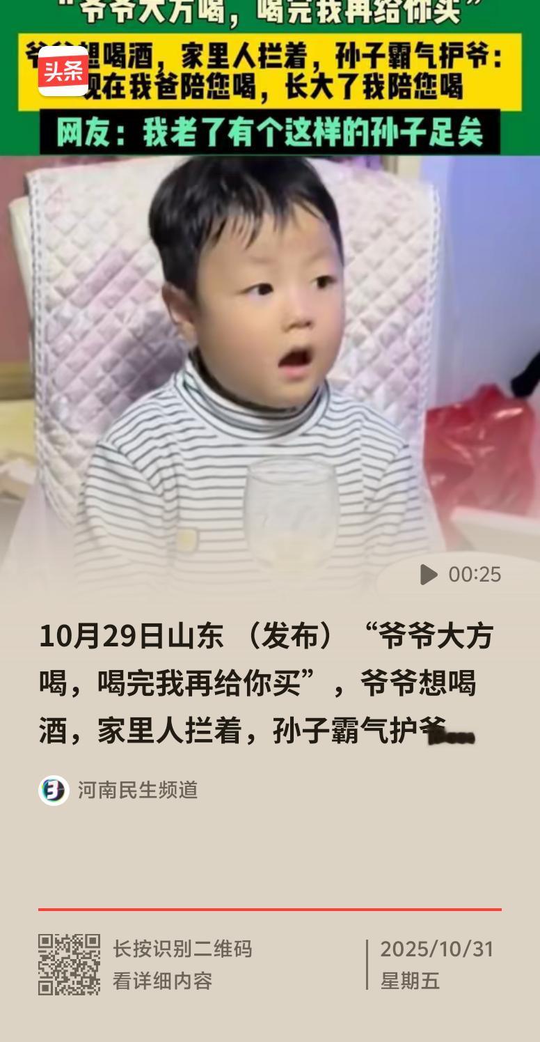 上周末在小区家常菜馆,张大爷带8岁孙子小宇和亲戚聚餐。饭桌上亲戚一个劲劝有高血压的张大爷喝酒,说不喝不给面子。小宇立马站起来挡在爷爷身前,霸气表示“我爷爷不能喝,你们再劝我就打电话给我爸”。亲戚们一下就住嘴了,邻桌都夸孩子懂事。 这让我想起我爸同学聚会,感冒吃药还被劝酒,喝了半杯当晚就难受。“劝酒文化”真让人头疼,把喝酒和情义绑在一起。小宇这一拦说出了大家的心声,隔代亲就是相互的,张大爷平时给小宇买进口水果,小宇就护着爷爷,太暖心了。