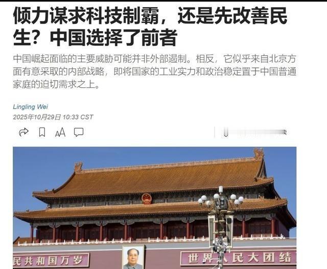 美媒声称中国的做法,完全错误了!10月29日,华尔街日报刊文声称,中国现在的做法,这是选择继续以科技与制造业为核心驱动力,而不是优先改善民生和刺激内需。北京在26年至30年的发展蓝图中,号召全国动员,采取“超常规措施”在半导体等关键技术上实现决定性突破,以加快科技自立自强进程。 10月23日,中共中央全会通过了关于制定国民经济和社会发展第十五个五年规划的建议,这个蓝图直指2026到2030年,核心就是加速科技自立自强。里面明确提到,要在半导体、人工智能、量子计算这些卡脖子领域搞出重大突破,还强调全国一盘棋,集中力量办大事。听起来挺硬气的,但华尔街日报10月29日的社论就逮着这点开炮,说中国这是死磕制造业和技术升级,忽略了老百姓的钱袋子和消费拉动,搞不好会自找麻烦。 我国官方文件里写得清楚,第十五个五年规划要把高水平科技自立自强摆在首位,目标是到2030年,中国在核心技术上基本实现自主可控。半导体就是重中之重,现在全球芯片供应链乱成一锅粥,美国那边卡得死死的,中国自然得加码。规划建议里提了“超常规措施”,意思是不能按部就班,得像过去搞两弹一星那样,全社会资源倾斜。举例来说,去年中国半导体设备自给率才13.6%左右,今年目标冲到50%,这不是小打小闹,得靠国家统筹企业、高校和科研院所一块儿上。华为、中芯国际这些企业已经在行动,砸钱建厂、招人搞研发,产业链从上游材料到下游应用全覆盖。规划还点名了新兴产业,像5G、生物医药、新能源,这些领域中国已经尝到甜头,出口数据亮眼,但要往高端爬,就得啃硬骨头。 华尔街日报那篇文章说,中国经济现在消费疲软,通缩压力大,工业过剩产能堆积如山,政府钱都投到跟美国抢高科技地盘上去了,没腾出手来推消费转型和社会保障。纽约时报也附和,10月29日的报道里提到,中国计划里虽说要扩大内需,但力度不够,户均支出增长目标定得“显著提高”,听起来含糊。路透社的分析更狠,说制造业还是老大难,即便有声音喊着要提振消费,中国还是把重心搁在先进制造上,担心这会加剧全球贸易摩擦。确实,中国现在出口导向强,去年制造业占GDP比重超28%,但内需贡献率才40%出头,远低于发达国家。美媒的逻辑是,你这么干,外部美国继续围堵,内部老百姓买买买的劲头上不来,经济就卡壳了。 这批评听着像在劝中国别折腾高科技,别解决瓶颈问题,好让美国继续吃大头。中国改革开放四十多年,靠的就是一步步产业升级,从低端代工爬到中高端制造。记得“中国制造2025”那会儿,美国也跳脚,说这是不公平竞争,结果呢?中国新能源汽车全球第一,光伏组件占市场七成以上,这些高利润行业拉动了就业和收入,居民生活水平才真正水涨船高。 规划里其实没扔下消费,官方明确要“显著提高居民消费率”,通过完善社保、减税降费、发展服务消费来刺激。比方说,今年上半年中国社会消费品零售总额同比增长3.7%,在线零售增速15.9%,电商平台上农产品卖得飞起,农村居民收入增速快于城镇。这些数据说明,科技升级和内需扩大不是对立面,而是互补的。钱有限,得把好钢用在刀刃上,先站稳脚跟,再谈花样。 美国从特朗普时代就开始芯片禁令,拜登接着干,2022年10月出口管制升级,高端光刻机、EDA软件全卡住。中国半导体进口依赖度高,去年芯片进口额超3000亿美元,这不是小数目。规划的“自立自强”就是应对这招,目标不是闭关锁国,而是少受掣肘。彭博社10月23日报道说,中国新规划是“对外部环境变化的回应”,要建现代工业体系,增强产业链韧性。量子计算、新材料、航空航天这些领域,规划都列为突破口,预计到2030年,中国核心技术自给率要达70%以上。这不光是为经济,还牵扯国家安全。 过去十四五规划里,我国科技投入占R&D比重超85%,结果是专利申请量全球第一,华为5G基站全球超七成。这次十五五规划延续逻辑,但加了消费权重。财新网10月24日分析说,规划把科技自立当成“核心变量”,但也强调人均GDP到2030年达中等发达水平,这得靠内需顶上。接地气点说,老百姓要的是稳定工作和实打实收入,科技升级能带来高薪岗位,像深圳集成电路园,平均工资15万一年,年轻人蜂拥而至。 总的来说,美媒这番说辞听着像老调重弹,核心还是不希望中国在高科技链条上站稳脚跟。中国规划的逻辑是务实的,先固本培元,再图后劲。2026到2030年是关键五年,外部环境复杂,中美摩擦不会少,但内部有14亿人口大市场,消费潜力巨大。规划里提了要建统一大市场,破除地方壁垒,这能让资源更好流通。历史证明,产业升级是民生改善的硬道理,没技术底气,谈什么都虚。