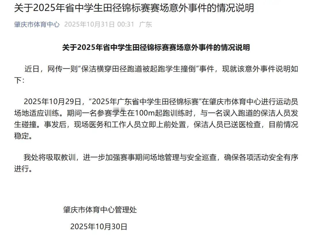 10月29日,广东肇庆体育中心一名保洁阿姨在横穿田径跑道时,被正在起跑训练的中学生撞倒,后脑勺着地,鞋子都飞出去了。幸好现场医务人员反应快,立刻把阿姨送医检查,目前情况稳定。 体育中心工作人员说,当时是运动员适应场地的训练时间,保洁阿姨不该出现在跑道上;但学生全神贯注起跑,也没注意到有人横穿。说白了,一个没看路,一个没看人。 肇庆市体育中心已经表态,要吸取教训,以后比赛和训练期间会加强场地巡查,确保跑道清场。毕竟这场锦标赛有全省3000多名学生参加,安全马虎不得。 撞人的学生虽然没受伤,但吓得不轻,留下了心理阴影。体育中心也打算提醒保洁公司:训练和比赛时段,尽量别让保洁员进场干活,避免再出意外。 有人吐槽:“跑道又不是散步的地方!”也有人心疼学生和阿姨:“都是打工人,谁都不容易。”官方通报没甩锅,老老实实认了管理疏漏,这态度值得点赞。 田径比赛和训练中,跑道是“高压线”,闲人莫入!运动员起跑时速度瞬间超20公里/小时,根本刹不住。
