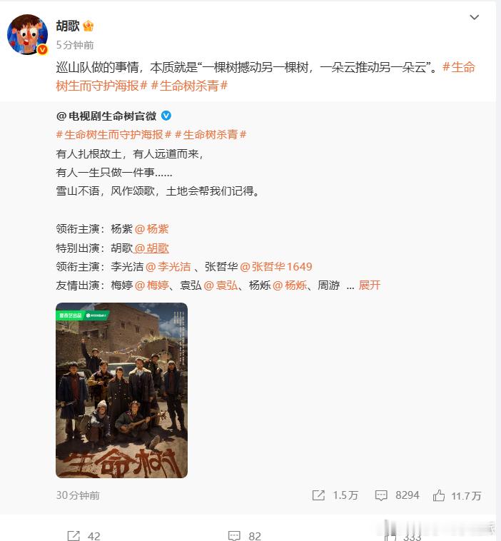 胡歌生命树杀青发文胡歌巡山队做的事杀青文盼“绿满大地”,他巡山队播希望:传