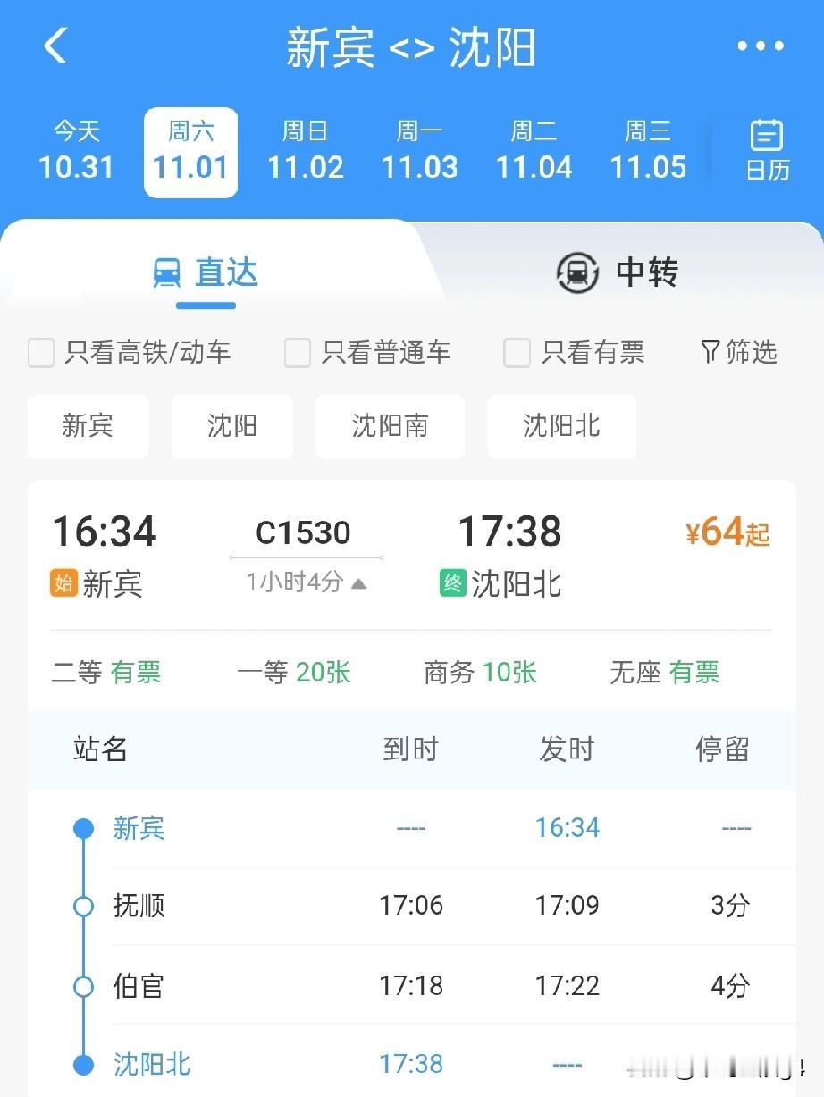 新宾站11月1日起始发开行列车变为两趟, 新宾站2025年9月28日开通运营,初期开行的是C1504新宾至沈阳的始发列车,而11月1日起改车次为C1524,并延长到本溪站终到,途经抚顺站,沈阳站,沈阳南站,原先到沈阳的91元,现在89元可以到本溪了,到沈阳站仅需要70元。 而且新宾站下午新增了一趟C1530次始发列车,新宾站16:34开,沈阳站17:38到,全程仅需要1小时04分,票价64元起,途经抚顺站和伯官站,是不是更方便了呢[呲牙]? 此外新宾站开行的列车。不再像之前那样可以到达青岛方向了,最多只能到达济南东站,其他的方向,长白山,长春,哈尔滨,北京等方向都正常通行。